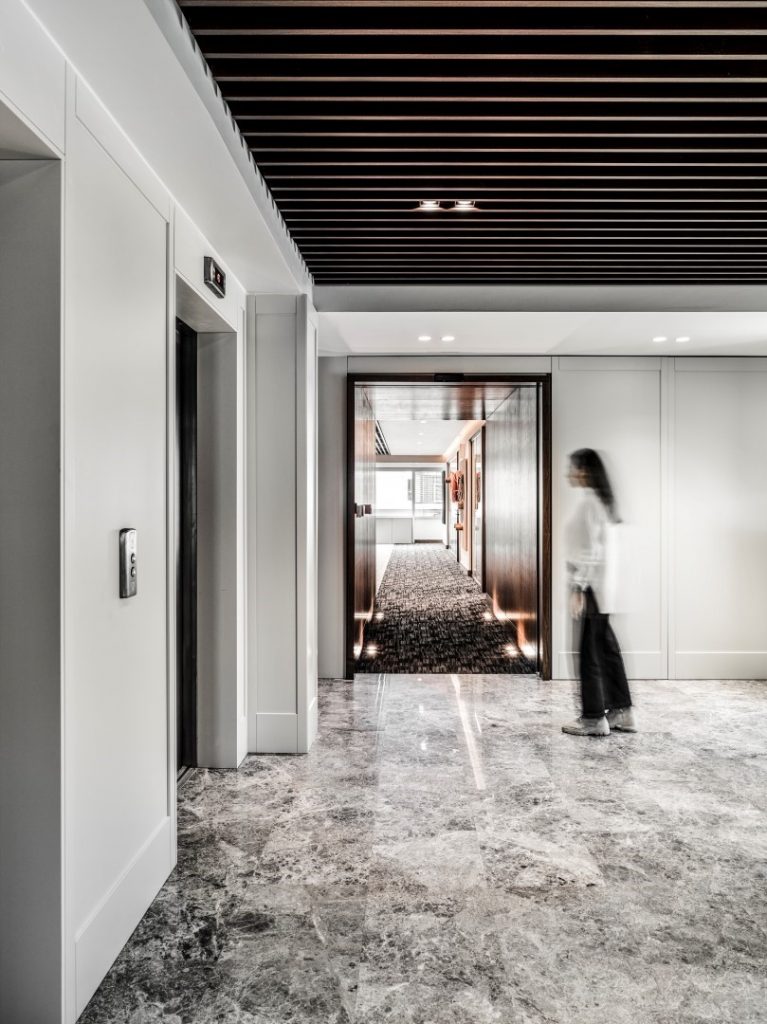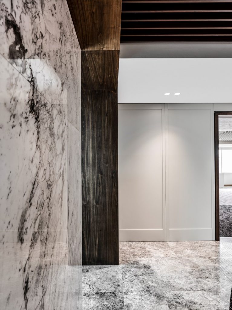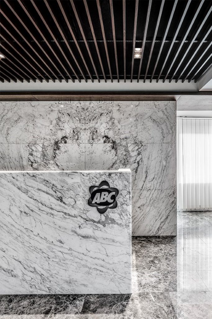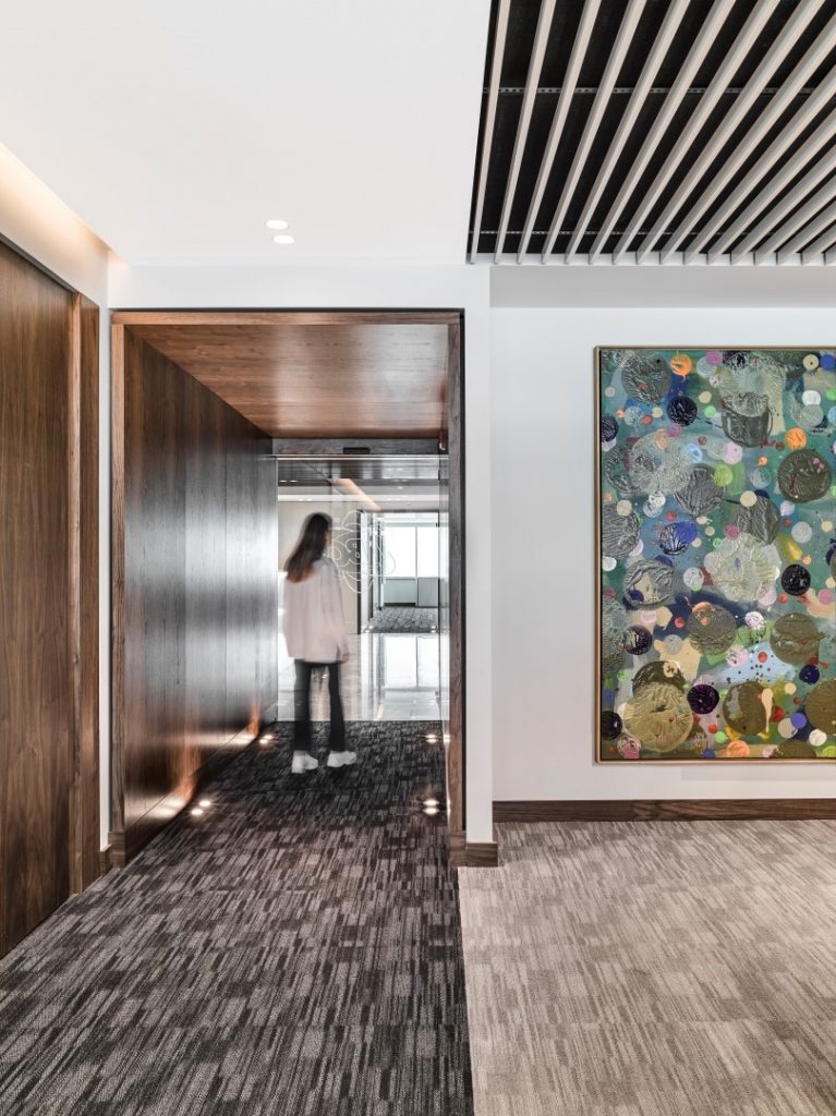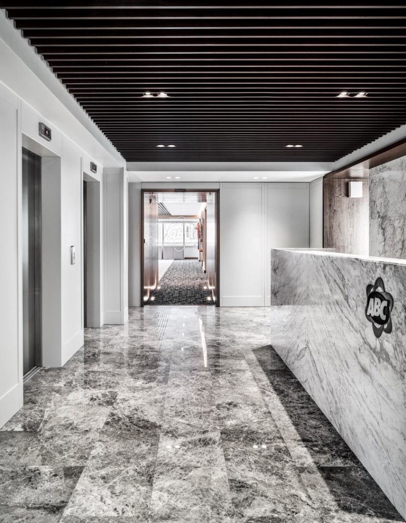 Mainly neutral color tones marble is used in the entrance hall for reception counter, wall and floor coverings when wooden material is mainly used in the neutral colored workspace. This detail created a spacious and warm atmosphere as well. Ömer Uluç, Selma Gürbüz, Refik Anadol, Ziya Tacir, Erdin İnan, Ali Alışır, Burhan Doğançay ve Haluk Akakçe’s works from the client’s art collection are used on the wall of executive rooms and individual workspaces.