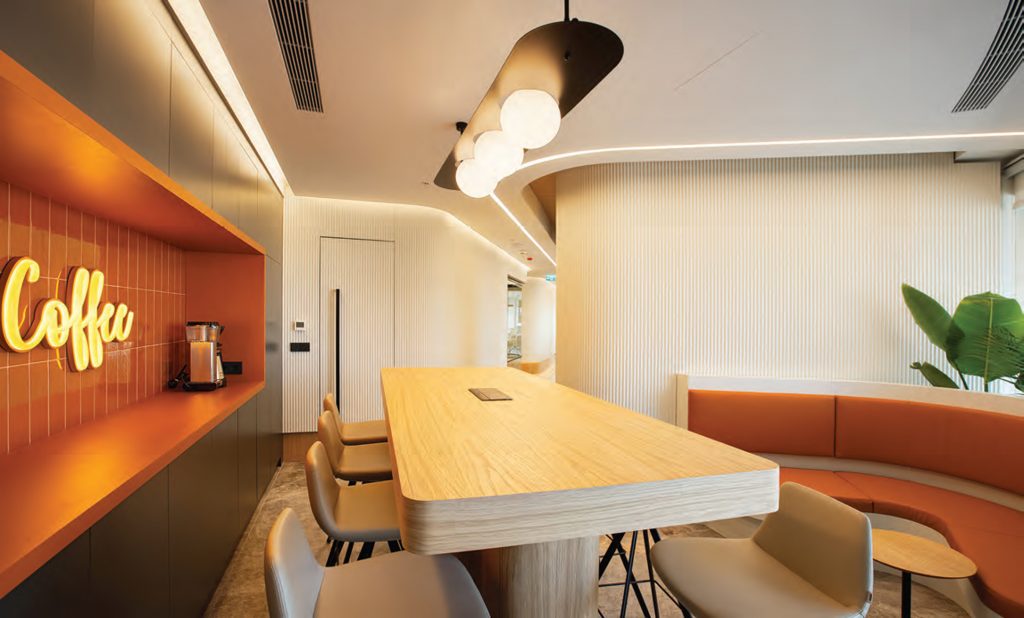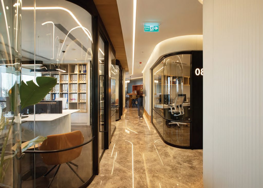 Akasya A15 Office, in the Akasya Shopping and Business Center which has a curvilinear plaza structure with a transparent facade and, is located at an important intersection of the main transportation arteries of the Anatolian Side of Istanbul; was designed by Thecatwork for a law firm in line with new needs by evaluating the formal benefits of the plaza building and user demands. Office plan with a central entrance half the size of its floor; the reception and meeting units are located in the center, with one branch extending to the working and service areas ending with the lounge area and the terrace, and the other branch to the management areas. Basically, the functions that are divided into office units and service areas are located inside the working and circulation areas outside the service area. Lighting was used so that the working units act as a single volume, independent of each other and at the same time strengthening their relationship with their surroundings. Curvilinear, transparent, independent working modules placed along the facade; allowed the light to continue horizontally throughout the office and penetrate the circulation line connecting the transparent modules. In this way, modules can be formed where acoustic needs can also be met under a single volume where the internal-external relationship is strengthened. The service areas remaining from this volume are positioned as opaque units close to the core with a horizontal corridor.
