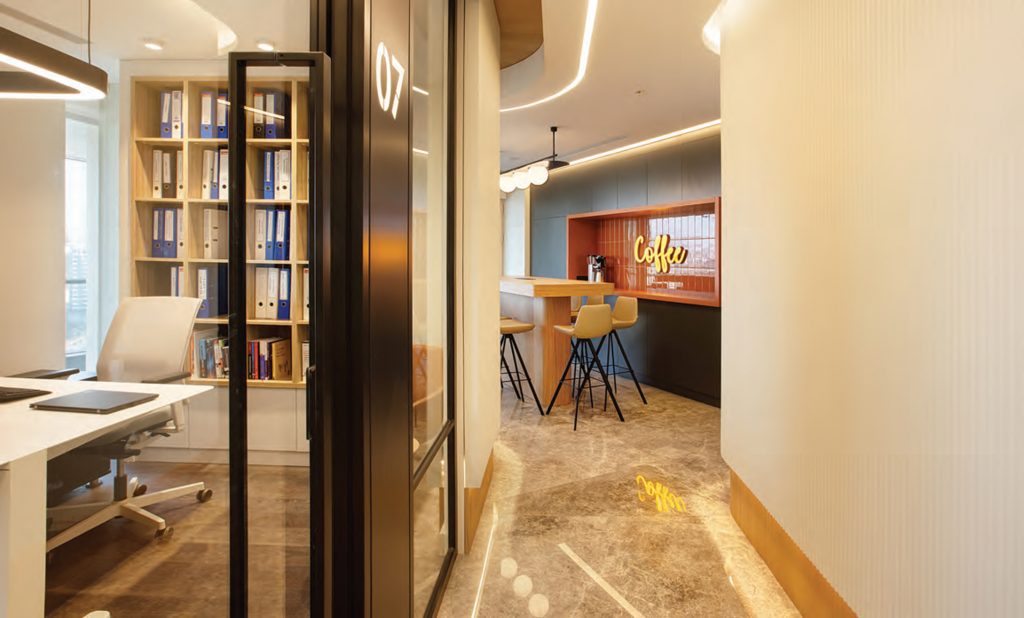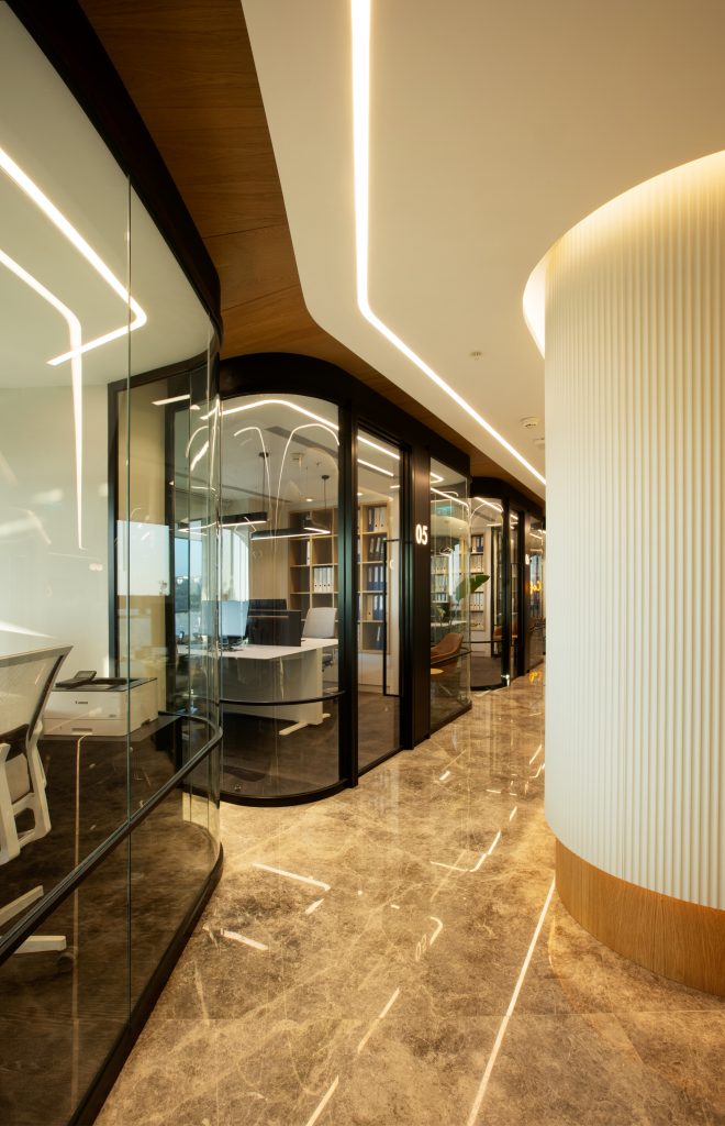 Material and color choices in order to emphasize the natural and continuous state of the design; uniform marble used in all circulation areas, glass dividers that provide transparency of the modules, and wooden panels of different textures and colors on the floor, wall, and ceiling. In addition to these three basic materials used, landscape and lighting lines that will highlight the form of the design were preferred. As a result of all these decisions; an office with a continuity that can be perceived at a glance, together with the decisions of light, material, and layout, has been realized.