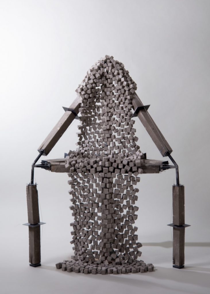 The design chair consists of a structural frame and a seat. Since the stone is very fragile, the two stones were joined together and the length of the chair was extended in case of fragmentation and shrinkage. To connect the two stones, a steel link was placed between them and the chair was fixed by the tensioning action of the wire. The chair’s structural framework is joined together by nine Akuseki stone units, and steel links connect each stone unit together to create a simple frame. A large amount of waste stone produced during the fabrication of the structural frame was used as the main material for the seat. 870 pieces of waste stones with holes of approximately 3 mm2 in them were knitted together to make the seating surface as soft as fabric. Since the artist aimed to minimize the amount of waste while designing the chair, he made the best use of the Akuseki stone fragments that emerged when the structural frame was created. Thus, he was able to use 95% of the Akuseki stone he bought as a part of the chair.