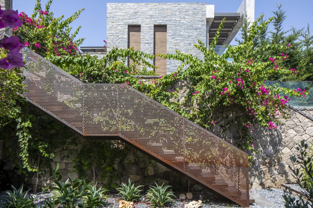 This decision is based in addition to taste on the imposing stone work done over the outer fencing facades of the unit. The balance created by the warm-looking metal and the relatively neutral concrete did accompany the stonework delicately without stealing its spotlight being a costly material. Combining landscape and architecture, the entrance is enhanced by copper planting pots, on-step light boxes, sculptures, a resting bench mid-way, and a varied selection of plants. All these elements harmoniously created an experimental walk through the entrance of the U-House.
