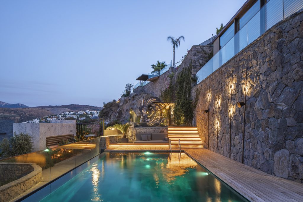 U-House designed by Slash Architects is a residential unit of the prestigious Seba Küçükbük Houses of Bodrum. This is a summer-house-type project that consists of independent villas within a private residence. The topography of the plot is highly diverse, the design had to find meaningful ways to connect these and make the U-House whole. The different zones of the design were as such: The main entrance, a staircase connection with the upper level, the pool area, an outdoor bar, a cocoon outdoor unit, and finally a service area.