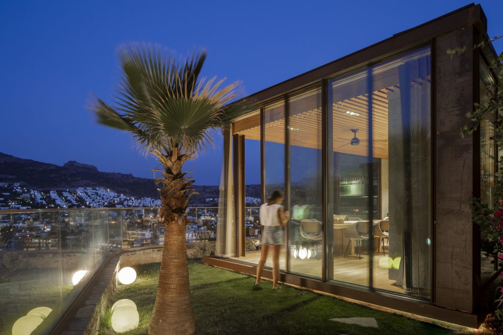 Ultimately, the star element of the architectural intervention is the annex home unit, or cocoon outdoor unit that was called U-Nest. The design language of U-Nest is a mixture of sobriety and sophistication with a minimal approach. Destined to perform essential tasks, it stands vigorously on a hill-like platform, facing a splendid sea view. This same view led to opting for a completely transparent façade representing a thin border between the indoor and outdoor environments.