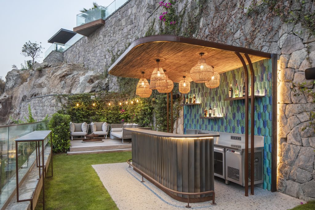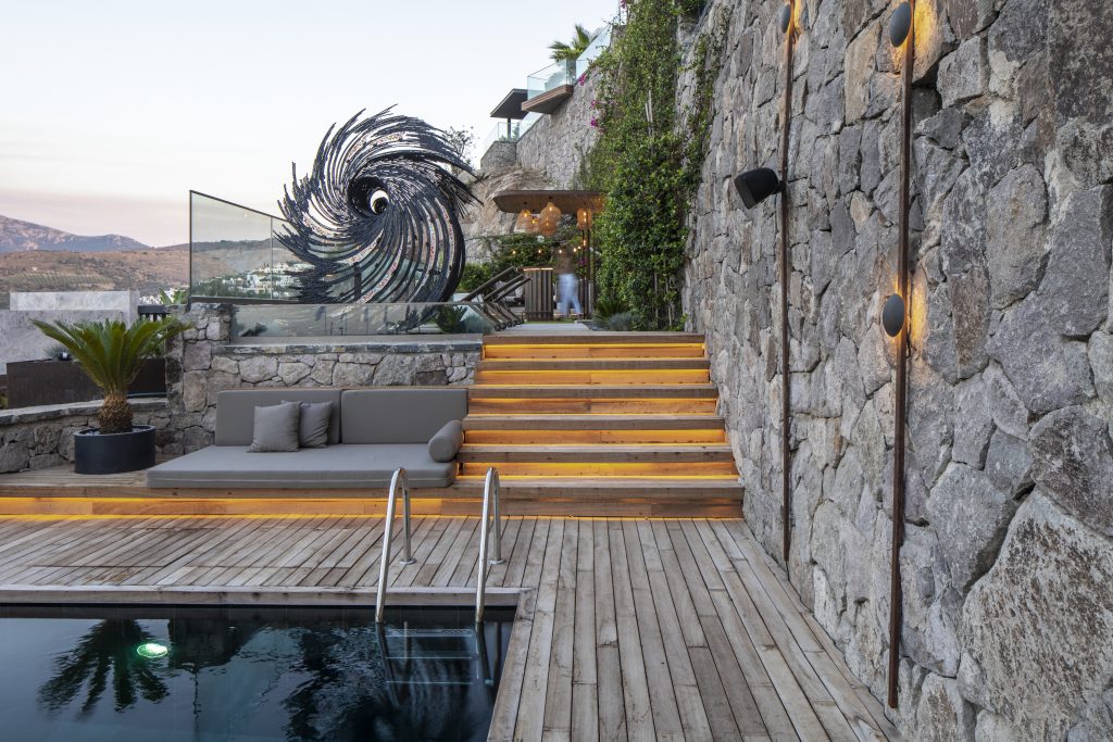 .The pool area was originally placed in an awkwardly isolated area excluding any sunbathing or seating elements around it, Slash Architects convened to create an appropriate environment around it. These design decisions included the surrounding wall, the in-pool leveling, and two different sunbathing areas. Right by the pool, a built-in day-bed-like bench is installed as an annex to the distant official sunbathing zone. Additionally, the flooring is entirely replaced by wooden decks to bring out the family house warmth to the outdoors. In a constant quest to exhibit the owners’ identity in the design, graphic, and lighting elements come to complete the architectural work. The outdoor bar area is connected to the pool area, a continuous flow and rhythmic design is portrayed through a precise material selection that is durable for the outdoor environment and the rest of the materials used.