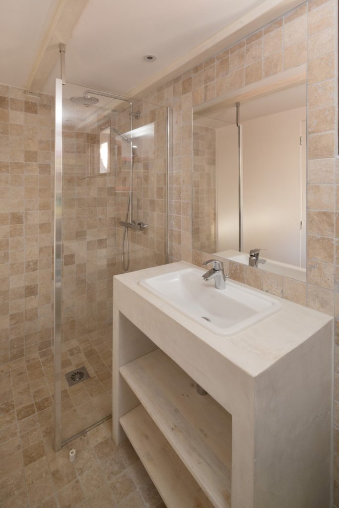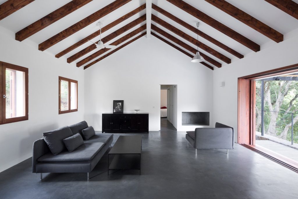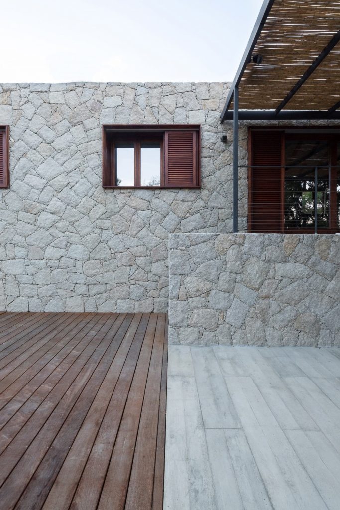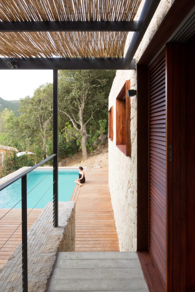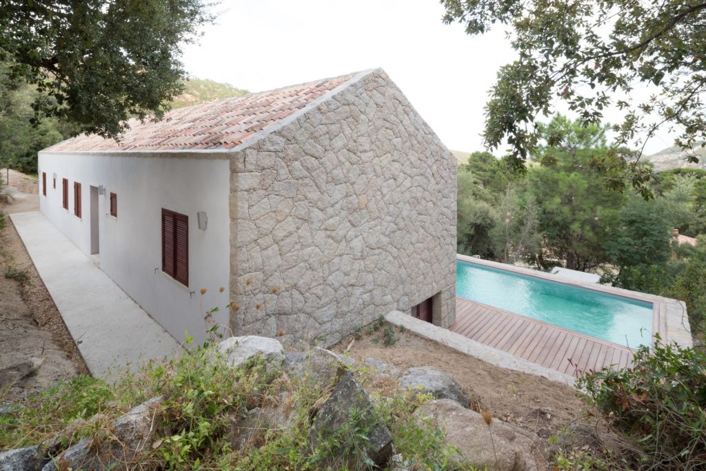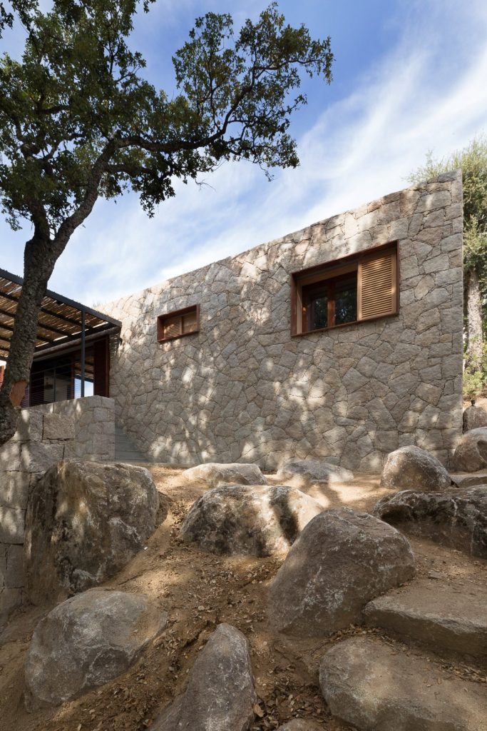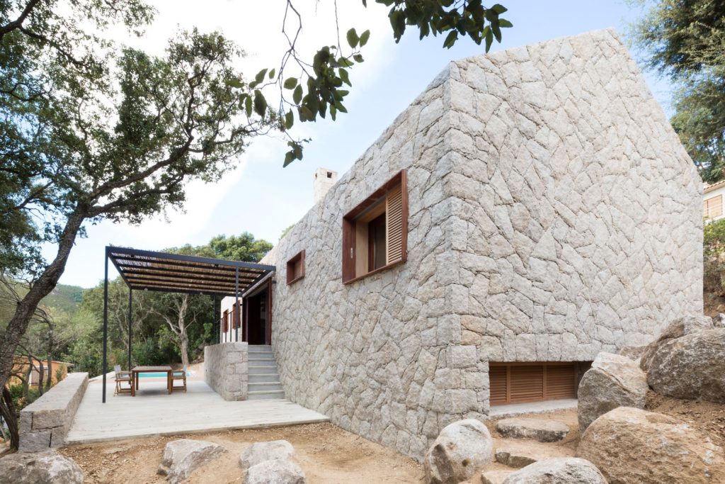Situated on a hill in the southeast of Corsica, an island connected to France, the holiday home forms a design language between local and contemporary. Consisting of a monolith mass, the building was designed using local materials and masonry, respecting its context. The house consists of 3 bedrooms for parents, children and other family members, 2 bathrooms covered with limestone tiles, a small kitchen in common areas, a living room, a long table for pleasant dinners and a mezzanine floor that is left empty to be shaped in the future. Outside the house, there is a terrace and a pool with a long table that meets the hill view.