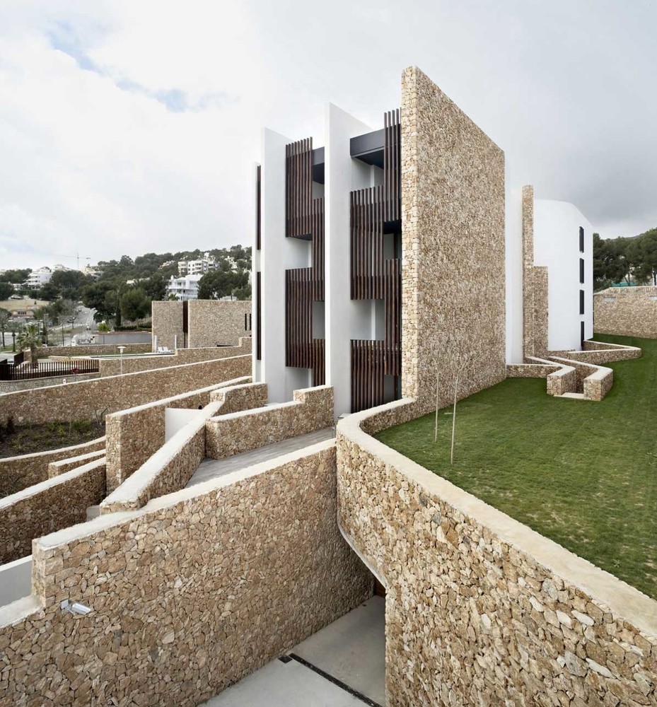 On the side of the building facing the sea, roughly cleaved stone blocks form dividing walls between the lodges. The walls step down in height as they extend out from the facades.The rough stone exterior walls are replaced with smoother blocks throughout the living space. The internal walls feature a distinctive surface texture that reveals their composition.