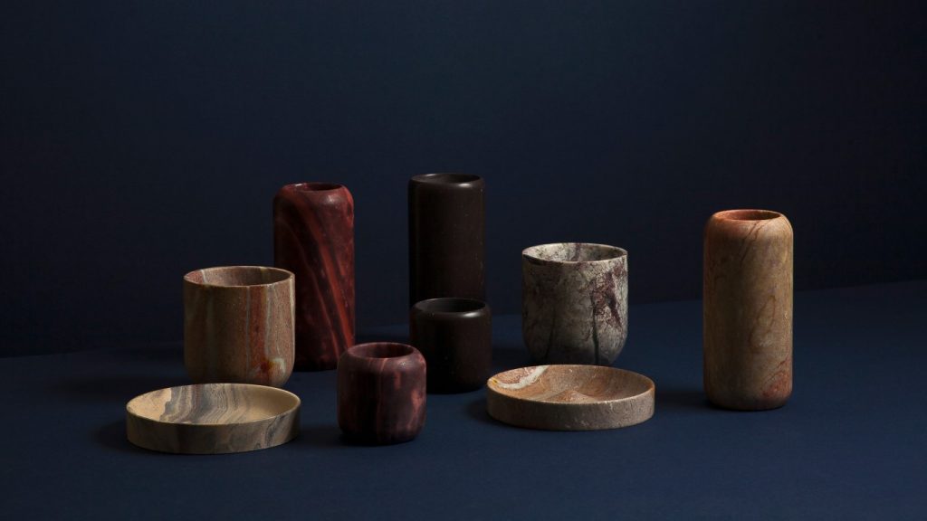 Another designer inspired by the waste materials from marble mining and cutting is Italian Francesca Gattello. Gattello worked with Rosso Ramina, a small Tuscan ceramic company, for developing a heterogeneous material by mixing clay with marble dust and designing rounded objects by kneading it. She uses a two-tone color palette to emphasize the raw material and hand-scored grooves on it. The collection’s name “Calcarea” is linked to calcium (Ca), marble’s most important chemical element. Calcarea collection ranges from pots and cups to vases and shallow bowls. These objects, produced in different sizes as prototypes, offer a unique experience as they carry the texture of marble and clay on them. The products are designed to be used both functionally and as an accessory.