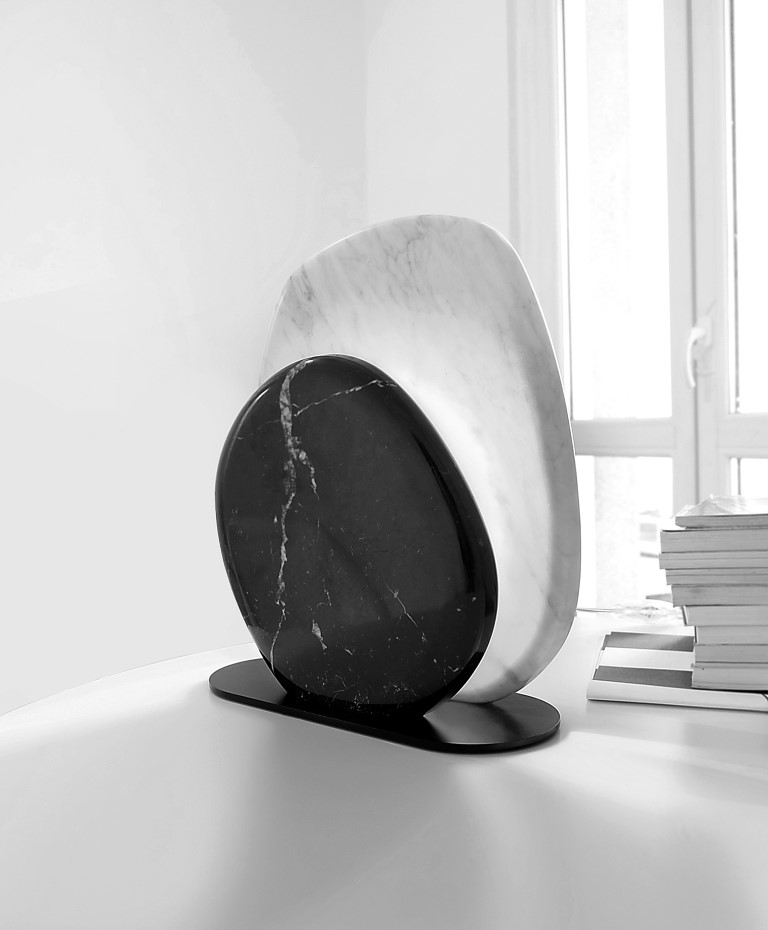 “Antumbra”, a touch-adjustable table lamp made of marble, was designed by London-based Magnus Long Design Studio. There are two different colors and sizes of marble used in the design. While on the front of the lighting polished black marble was used for cutting the light, and polished white marble, was used to diffuse and reflect the light at the backside in the design. The illumination, which appears to be a simple composition of black and white marble pieces when the lamp is turned off, presents an image similar to the solar eclipse observations of ancient time sculptors when the lamp is turned on. The large white marble circle at the back reflects the light, while the opaque black marble circle at the front is perceived as a silhouette by the light reflected from the back. Magnus Long pushes the physical limits of the material with the white marble he uses as a reflector and the black marble he describes as a “mask” for the light source. The lighting cable is hidden behind the steel base where the marble stones are placed, and the light level can be adjusted according to the environment via the touch-sensitive switch inside the stone in front. Offering various uses with different lighting levels, this unit noticeably increases the aesthetics of the space.
