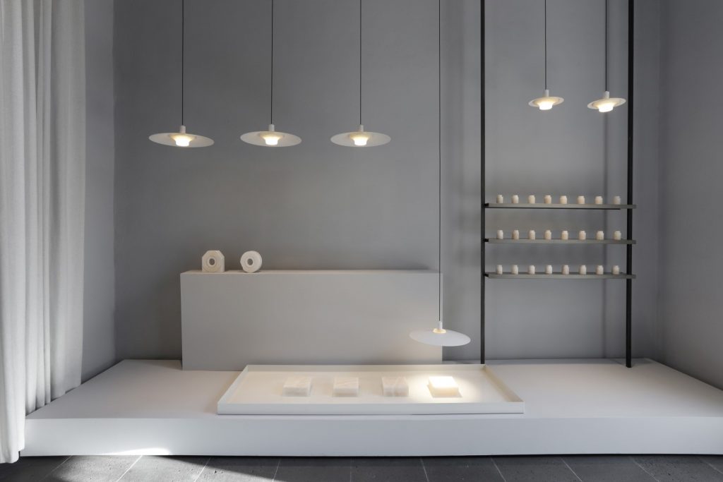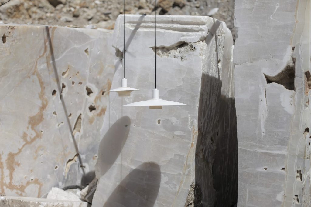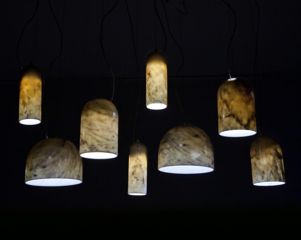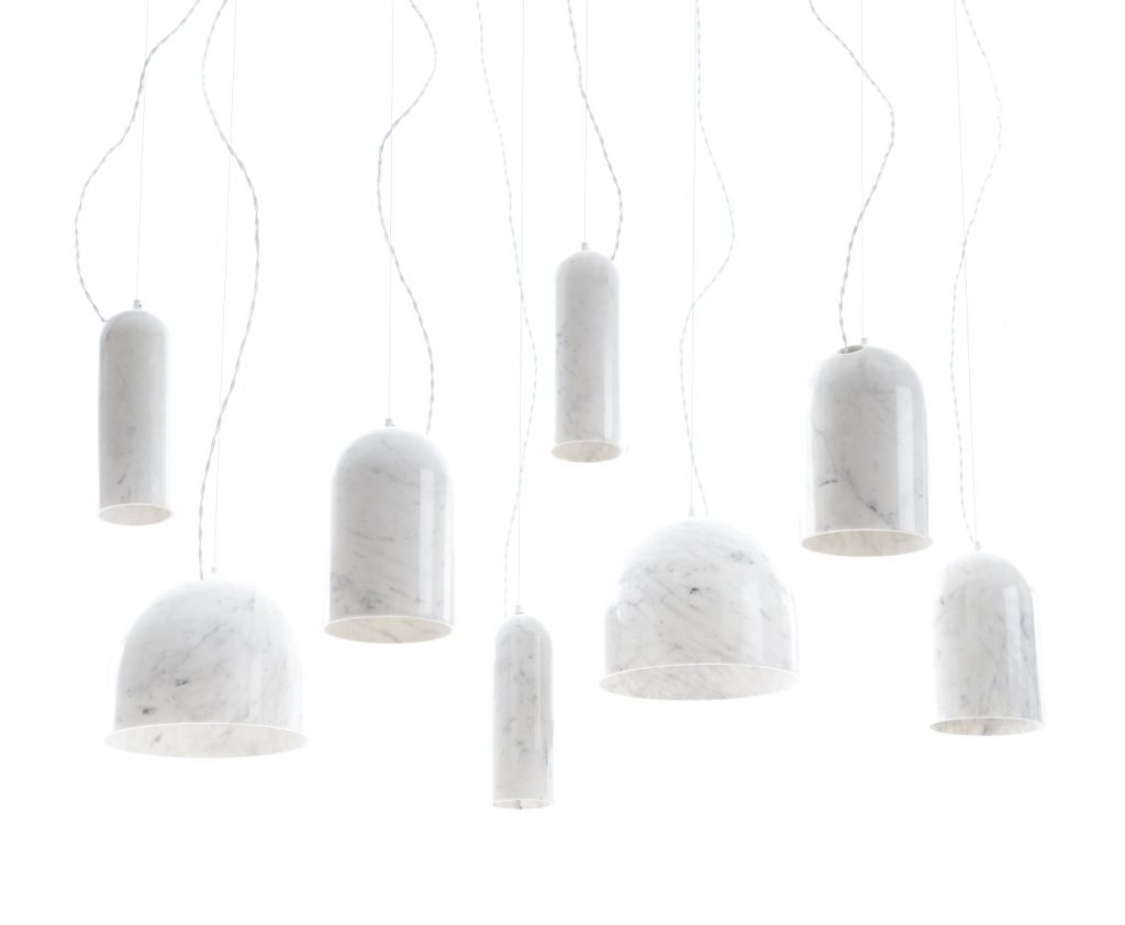 İngiliz tasarımcı Benjamin Hubert tarafından tasarlanan “Quarry” isimli koleksiyon, bir dizi ince duvarlı mermer sarkıt aydınlatmadan oluşuyor. İnce yapılı mermer sarkıt lambaların el işçiliğiyle oyularak oluşturmuş iç yüzeyi, taş lambanın üretim hikayesini ve dokusunu gözler önüne seriyor. Tasarımda ışığı dağıtmak için mermerin yarı saydam özelliğinden yararlanan tasarımcı malzemenin damarlı dokusunu ön plana çıkarmış ve geleneksel malzemeyi, büyük boyutlarda kullanıma uygun LEDler kullanarak dengelemiş.