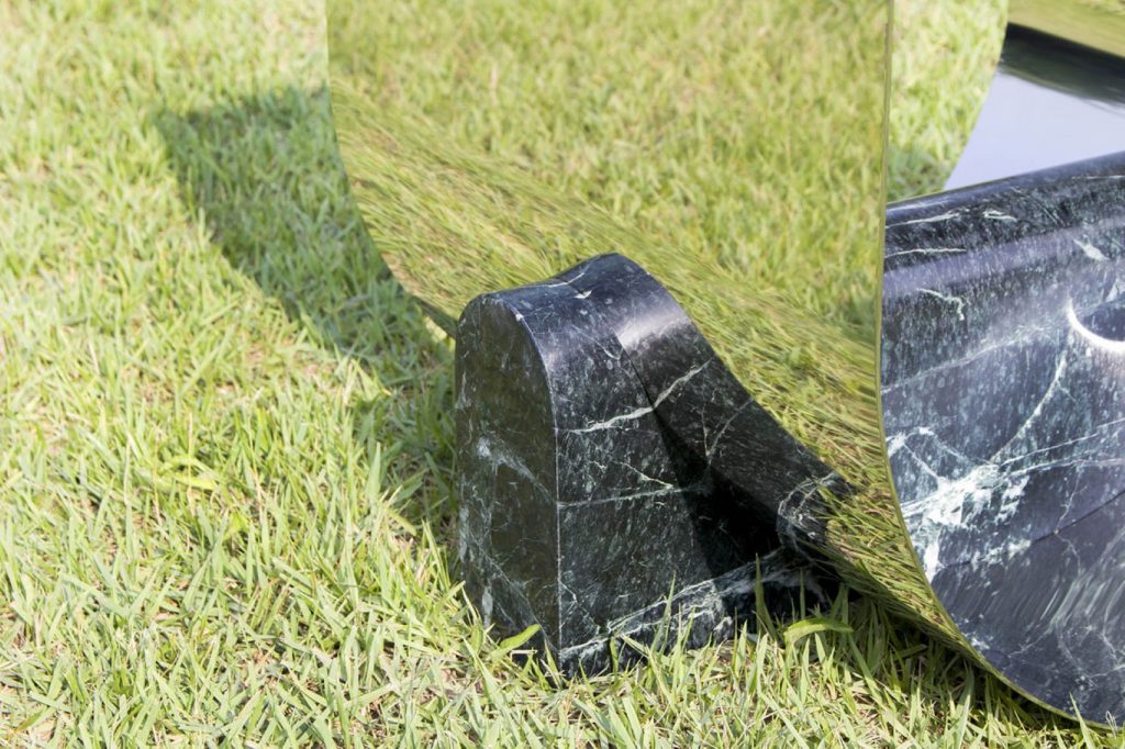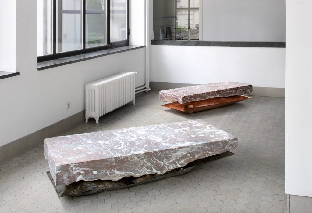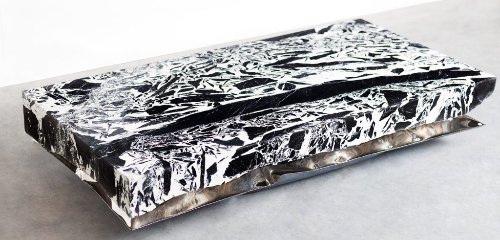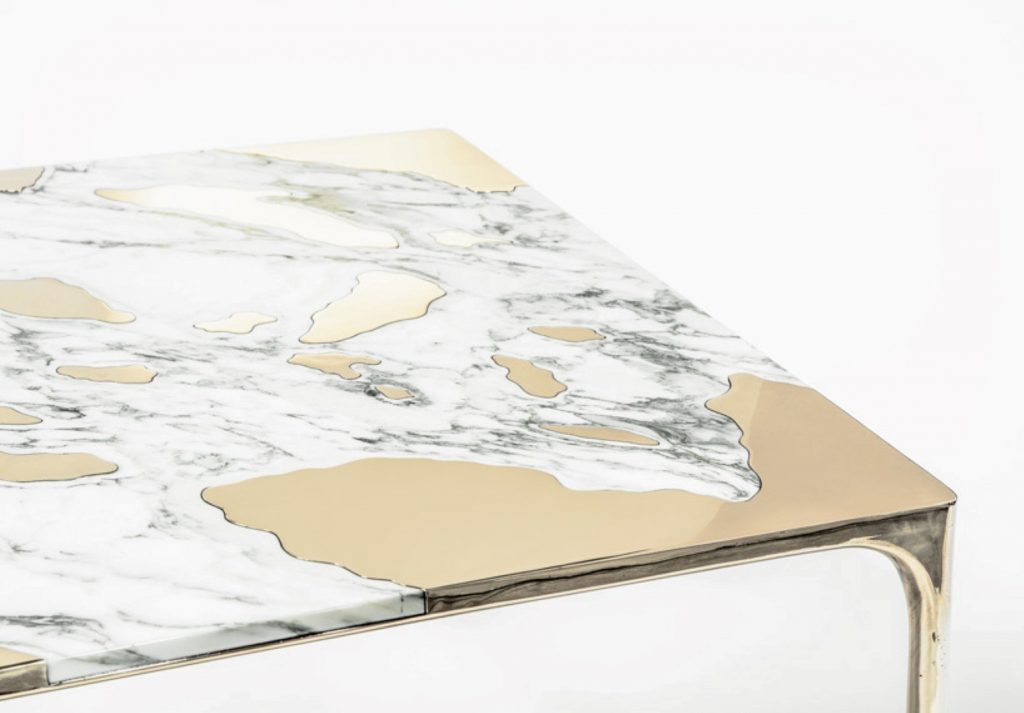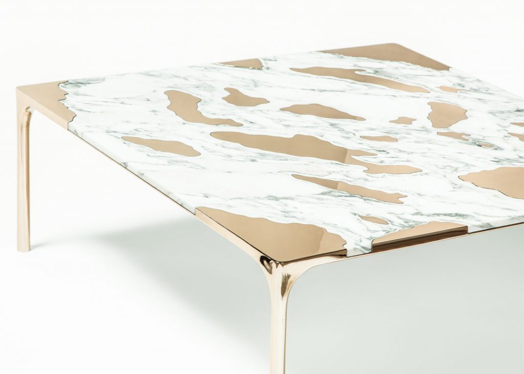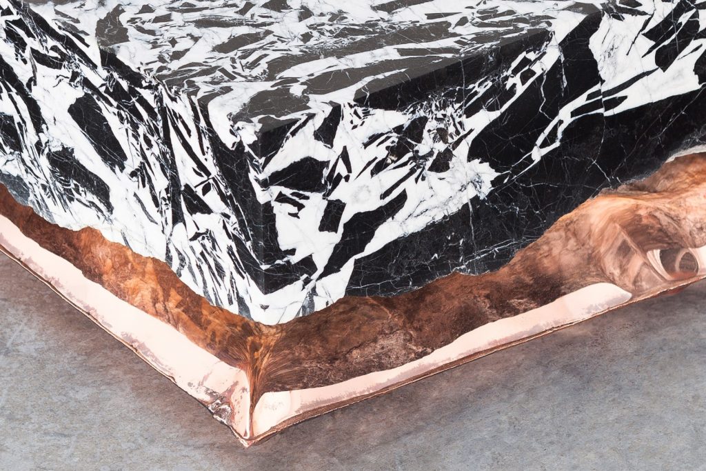 Şilili tasarım stüdyosu GT2P, New York Friedman Benda Galerisi ile işbirliği yaprak mermer ve bronz malzemenin bir araya geldiği masalar üretti. İlk kez 2015 Design Miami Festivali’nde meraklılarına sunulan tasarımlar, mermer tabla ile bronz bir strüktüre sahip. Marble vs. Bronze adı verilen tasarımın üretim sürecinde büyük mermer plakaların damar noktaları dijital ortamda tespit edilerek, su jetiyle hangi alanların kesileceğine karar verilmiş. Mermerin doğal yapısındaki damla şeklindeki boşluklar bronz malzeme ile doldurulmuş ve strüktürde de bronz kullanılmış. Masa tablasının iç kısmı daha düzensiz bir malzeme birleşimine sahipken bronz ayaklar minimal tavır izleyerek yapısal destek sağlıyor. Çalışmaları sırasında farklı malzemelerle deneyler yürüten tasarımcılar, bronz ve mermerde istedikleri uyumu yakaladıklarını ve geleneksellik ile modernite çizgisini yakaladıklarını belirtiyor.