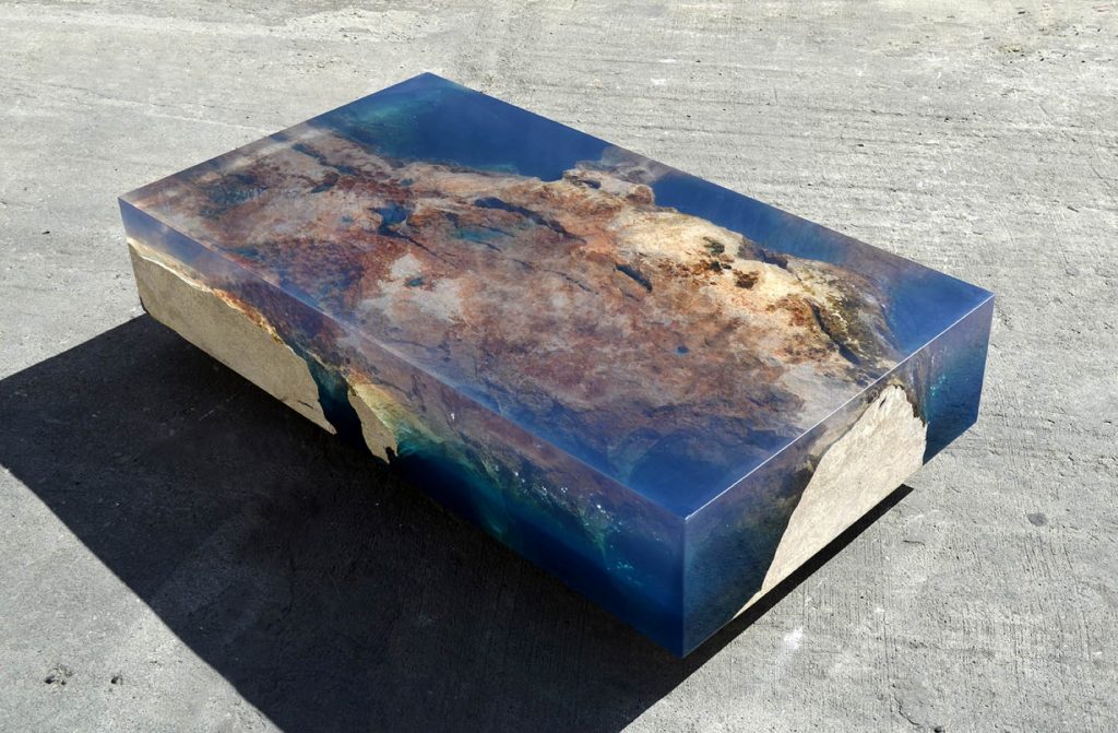 Doğal taş ve reçine kullanılarak üretilen La Table adlı masa tasarımı, doğal taşın kendine özgü dokusuyla onu bir okyanus gibi saran mavi reçineden oluşuyor. İki yılı aşkın süren araştırma aşamasından sonra masa tasarımında Karayip bölgesinden çıkarılan ve bir ada kıyısı görünümü sunan traverten malzeme kullanılmaya karar verilmiş. Mimari bir topografya gibi şekillendirilen traverten, inklüzyon reçinesi adı verilen malzemeyle birleştirilerek üretilen konsept, isteğe göre bu oranların değiştirilmesiyle daha şeffaf veya daha opak görünüm sağlayacak şekilde farklılaşabiliyor. Tasarımcı Alexandre Chapelin ve Patrick Lapierre tarafından tasarlanan dikdörtgen masalar, uçak penceresinden okyanusun içindeki bir adaya bakma hissini yaratmayı amaçlıyor.