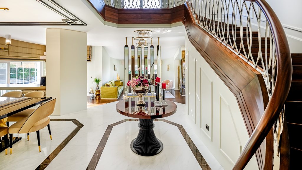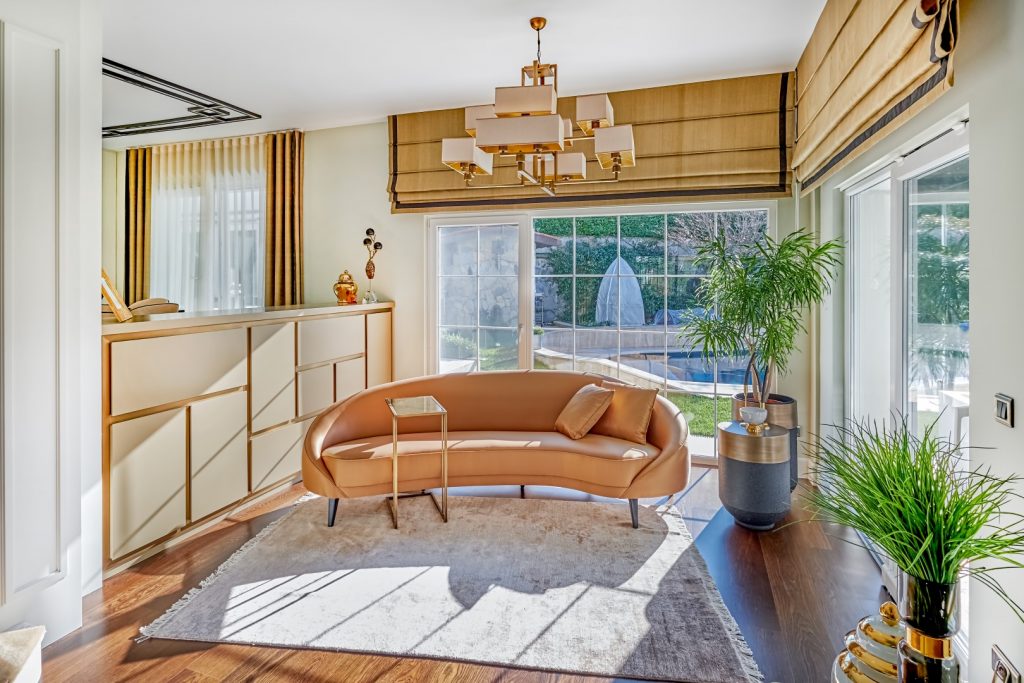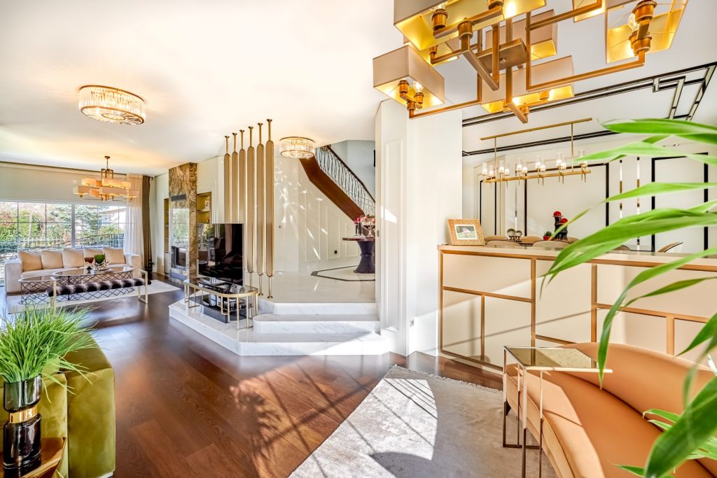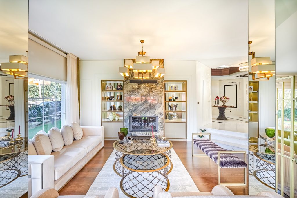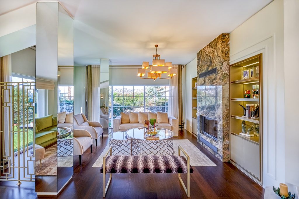 The Egeli House in Zekeriyaköy, whose interior design was designed by Pozitif Mimarlık, offers a luxurious modern style living space in the middle of nature with 400 sqm usage area. The main request of the owners of this detached house, was to have a charming and functional living room with modern luxury decoration. Extension of the living room into the garden and also enlargement of the windows was the main idea of the renovation. As a result of that idea, it was possible to feel the garden inside the house and enjoy the beauty of nature much more. The living room is divided into 4 regions. A dining area for 10 -12 people, a sitting area where you can enjoy the warmth of the gorgeous fireplace, a second sitting area for watching TV and a small corner for enjoying drinks or books facing the beautiful garden and swimming pool. Materials such as black and white marble at the floor of the entrance and dining area, wall claddings with white lacquer surface and shiny metal frames are the interior features which are used to emphasize the modern luxury atmosphere. The stairs of a helicoidal form are supporting this atmosphere with its successful combination of the shiny high-tech railing with natural dark wood flooring. This balance in combining materials can be observed in various features in this house. A special separation made of metal framed mirrors is designed to create a TV area which gives a little privacy to family while watching TV.