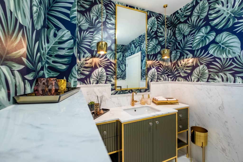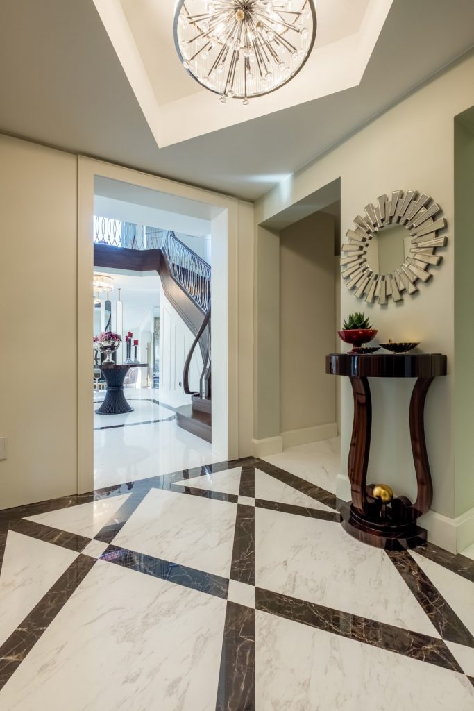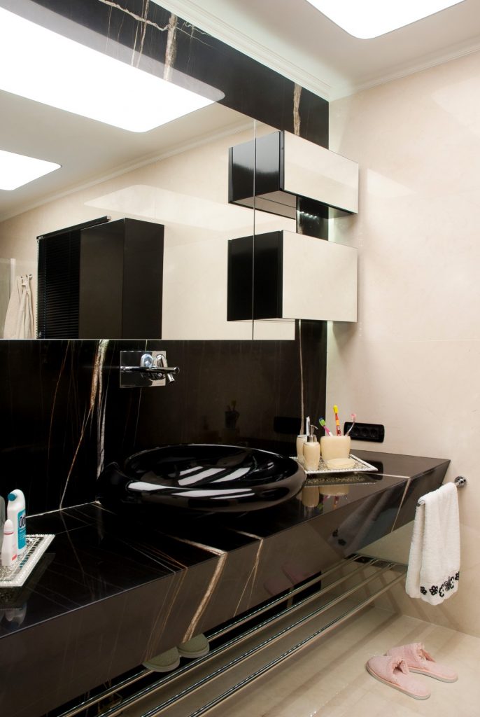 A very attractive semi-precious stone is chosen for the marble cladding of the fireplace. This facade and bookcases designed for both sides of the fireplace give a gorgeous impression here. This luxury modern decoration can also be seen in guest WC with its marble flooring and natural themed trendy wallpaper. Washbasin cabinet made of lacquered wood and shiny metals is designed to fit this atmosphere. Also, the bathroom in parents suit is decorated with shiny black marble and “piano black” lacquer furniture items.