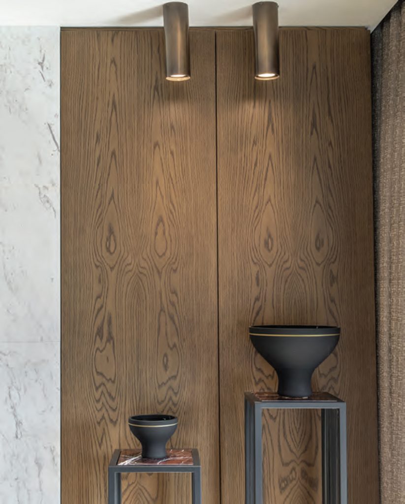 While a spacious and calm effect is provided by marble, the warm effect of wooden surfaces is balanced with this cold material.