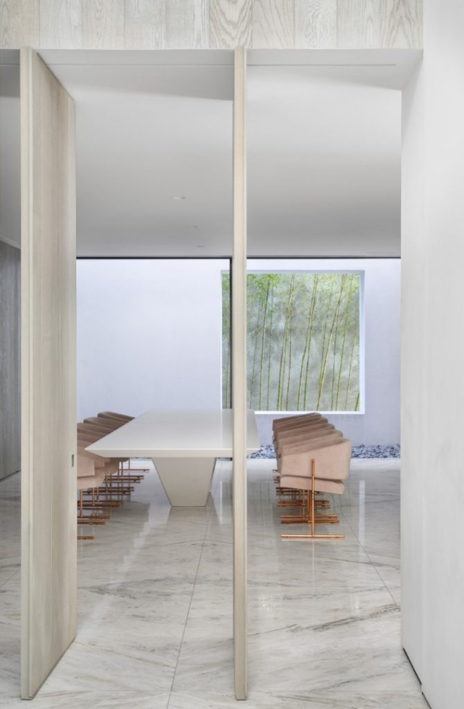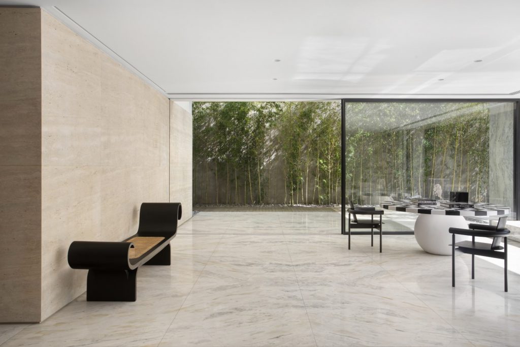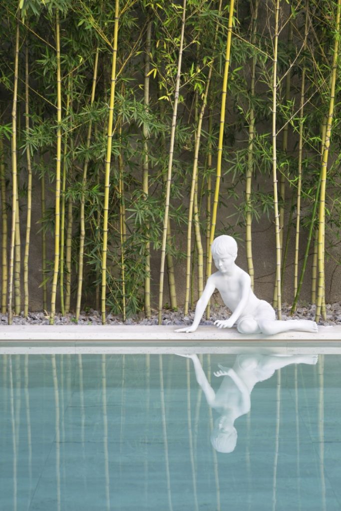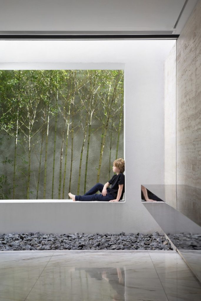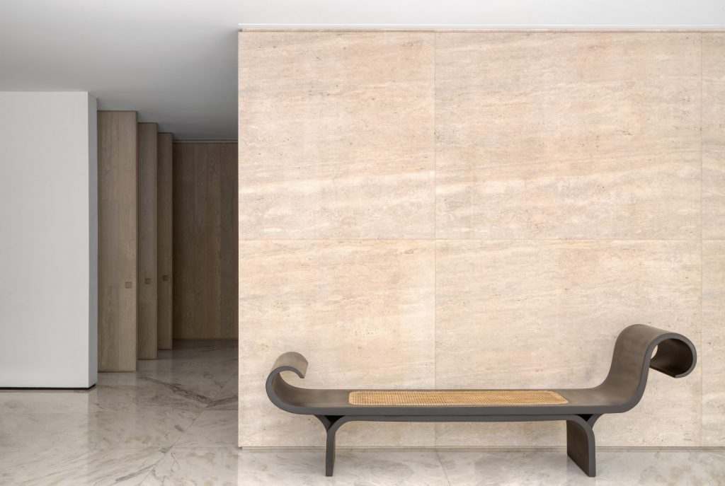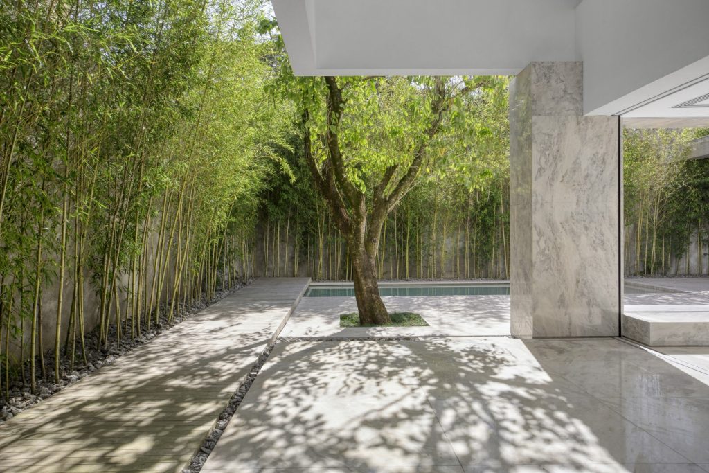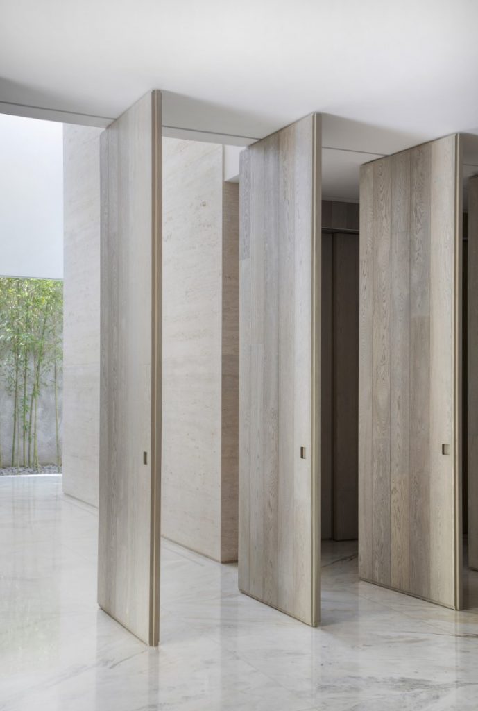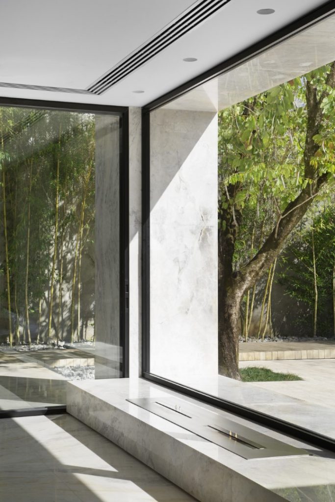 In 2016, the clients hired Studio Guilherme Torres to develop an interior project for an apartment purchased while still on the floor plan. The building, possibly from the end of the 50’s, built in a tree-lined but central neighborhood, presented a miscellany of styles, coming from successive expansions and renovations, but it had the ideal area. An ambitious renovation project began, which reconfigured all the spaces and brought the construction. Some distribution points in the house were maintained, such as the garage and services at the front, as well as the stairway position. Others were completely reconfigured, such as the living room, which now completely unfolds to the back of the land, where the swimming pool and leisure area were repositioned. During the demolition phase, many structures were in a precarious state, which ended up generating a completely new structural design, which was redone from scratch. A request from the owner was that the house be extremely luminous, with as many openings as possible and with materials that reflect natural light. For this purpose, the use of minimalist aluminum and glass frames, white marble throughout the ground floor, and some walls in raw Travertino, chosen for the entire outdoor area, including as a coating for the pool, were explored. Pivoting doors and walls that hide openings and cabinets were covered with a species of extremely resistant Scandinavian pine that has a naturally greyish hue. Most important of all, the house ended up getting a rooftop of around 150 sqm, which was completely intended as a space for the three children. The children’s furniture, which includes in addition to cabinets, stage, climbing walls, running track, “little shop” and “kitchen” were all developed by Studio’s architects, in partnership with the client.