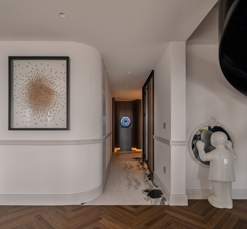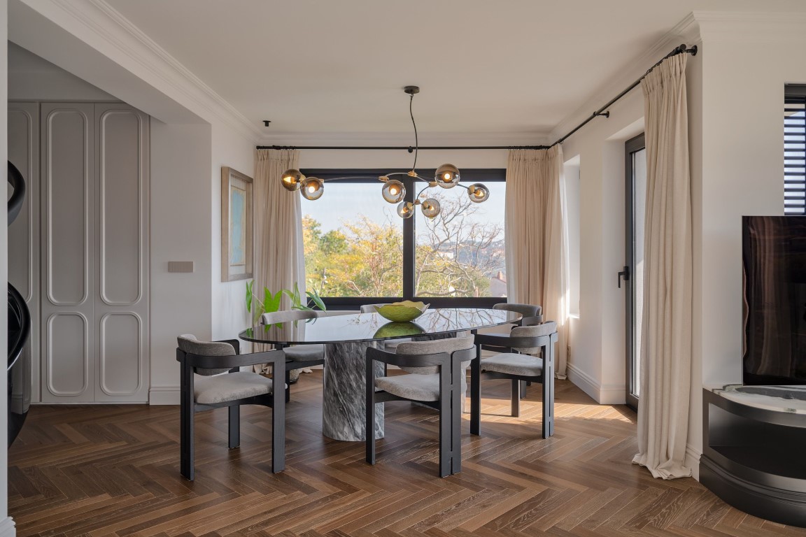 House K was designed with the intent to have spacious, view oriented, inviting, ‘gallery-like’ plain background where the residents’ artworks are exhibited, also welcoming atmosphere that invites people having cosy & pleasant time. Building materials such as wood and marble were designed as sculptural architectural elements in places and circular walls, rounded corners were added to the decoration that support the flowing plan. The space, which resembles an art gallery dominated by gray top-toned wood herringbone parquet, wide white walls and black and white colors, creates a modern living space that showcases its originality with lighting installations, artworks, sculptural furniture and the staircase that we designed as an architectural sculpture.