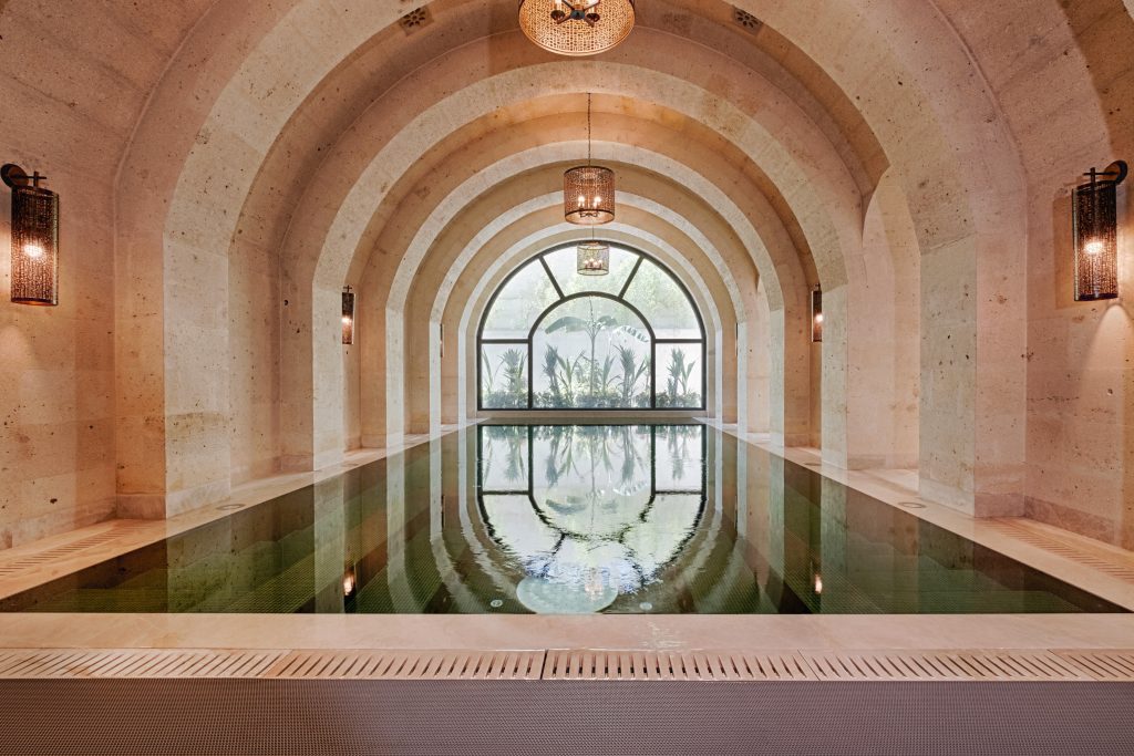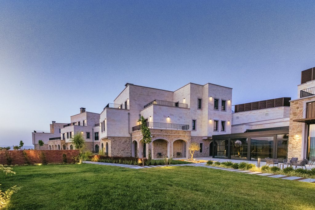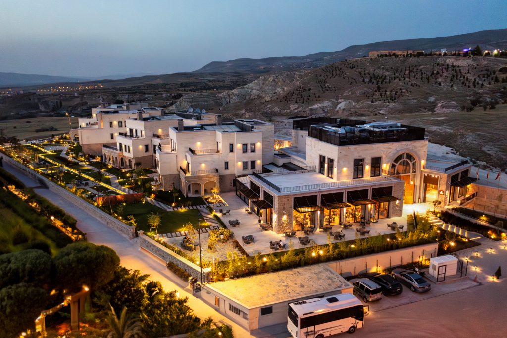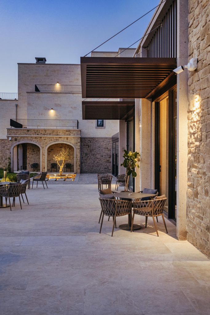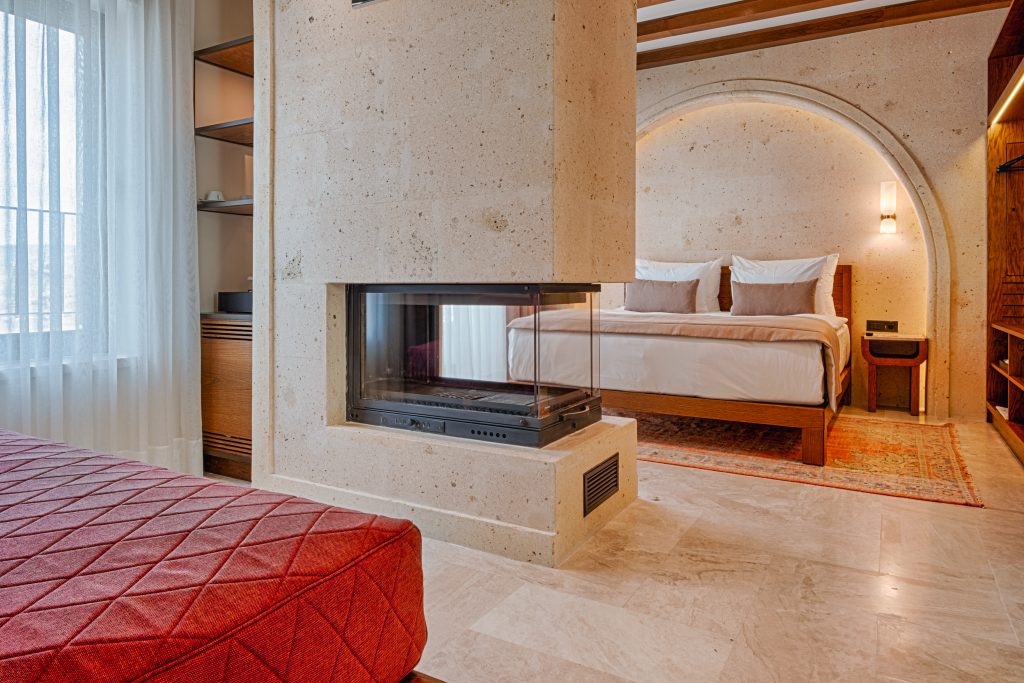 Cappadocia Alden Hotel is located in Ürgüp, Cappadocia, with its architectural design created by Cofact Architecture and Engineering, and the interior design revealed by Onk Design. The project offers a contemporary interpretation of the “identity” formed by the conventional masonry method on slightly sloping land. Traditional stone mansion architecture and the layered mass movements it creates are the main elements that give the project its locality. The accommodation blocks, appearing to settle spontaneously on the land according to the landscape and plan solution, constitute the basic elements of the local identity. Stone from local quarries is processed and cut to various sizes, placed on the façade using cut stone to give the upper floors a “headroom” like impression. On the garden floors, rubble stone is applied as in the traditional process. The “stone mansion” architecture unique to Cappadocia aims to provide guests with a local mansion experience rather than a city hotel, with its strong character and associative imagery. Considering the conditions of the time and the intended use of the building by guests, some comfort criteria gain importance. Considering that guests will come from different parts of the world, an interior design in line with universal design principles has emerged.