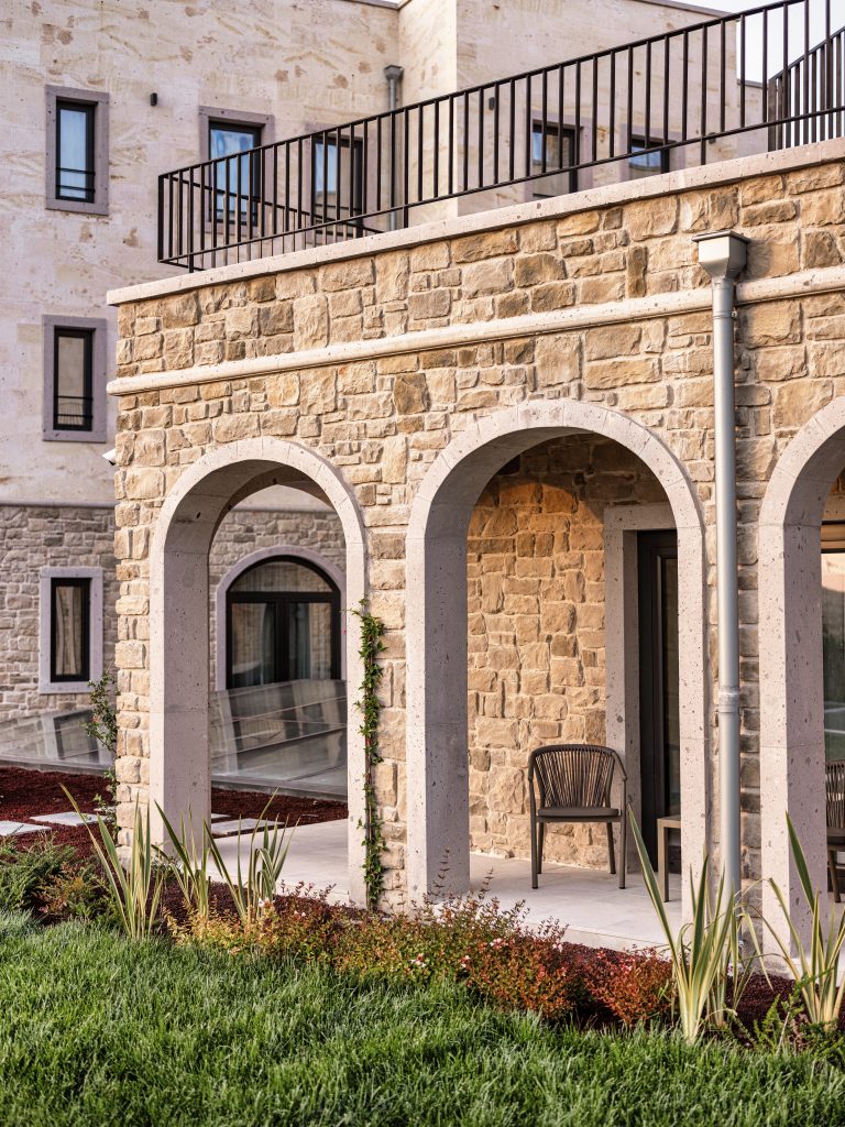 Cappadocia Alden Hotel, consisting of four mansions and a service building, reinterprets the architecture of Cappadocia with its orientation, the spaces between the buildings, the three dimensions connected by arches, emulating local architecture, adopting traditional architecture, but with its way of being and its unique details, it has an appearance that is too original to imitate. What was learned from Kayadam architecture, underground cities, and traditional Cappadocian mansions were the main elements that helped to create the project’s spirit. Integrating all these local and “architecture without an architect” products with five-star comfort and service standards, not to take away the feeling of being in the region when guests return to the hotel, but to host them in spaces that give pleasure and peace on another level, are among the design concerns of the architecture as well as the interior architecture and landscape.