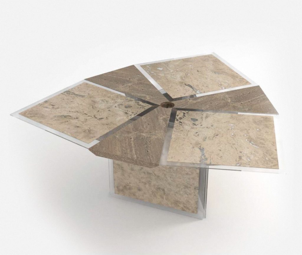 “Mórfo” by Silvia Sandini is an octagonal table inspired by the morphology of crystals in stone materials. Depicting a metamorphic and temporal process, the design is made from a single marble slab and combined with stainless steel pieces. Sustainability and material savings are prioritized in the design.