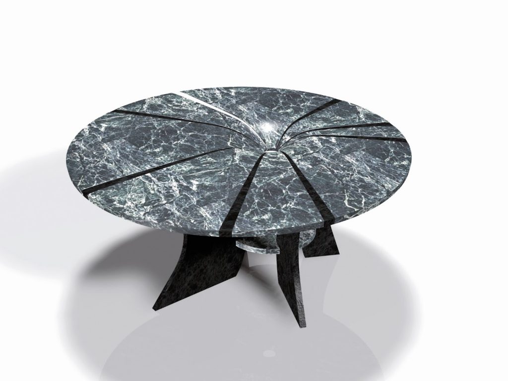 “Trill” designed by Ascanio Zocchi, inspired by spiral figures symbolizing cyclical continuity such as the universe, human DNA, and the flow of time, is produced with two kinds of marble. Black marble is used in the spirals, which represent the three forces of nature that create, protect and destroy, located on the top of the table, whose base and top are made of white marble.