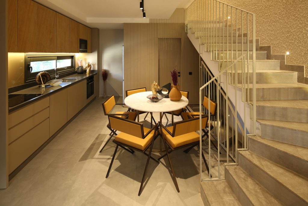 In the interior, slate is preferred in order to harmonize with color, texture, size, and architectural language. Slate with thin and hidden mortar was applied in order to make the spaces look wider and more spacious than they are and to obtain an unlimited view. Slate is a local natural stone extracted from Bayındır, İzmir. Especially in the living room, it aimed to control the scale with the use of natural stone and to provide warmth, peace, and serenity in spaces, as well as to capture a unique ambiance.