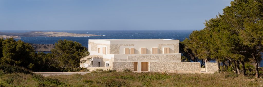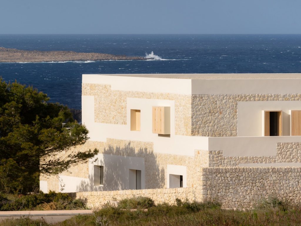 The client’s explicit wish to take strong references from the local traditional architecture faced the challenge of not falling into püre replica. The facade’s composition responds to a reinterpretation of the Menorcan custom of framing windows and edges with white plaster, thus creating a geometric patchwork of off-white plaster and light-tone stone. Thin steel frames project beyond the solid facade to protect the windows from direct sun and support the foldable wooden shutters. In order to enhance this thick/thin contrast, all windows were aligned to the interior and its frames were embedded from the outside creating the illusion of open holes on a stone wall. Similarly to the facade’s earthy palette, the interior is a combination of continuous sand-coloured concrete pavement, whitewashed walls, pine wood carpentry and white-veiled wooden beams. These natural materials create a both warm but also airy atmosphere within the pastel range. All built-in kitchen furniture and wardrobes are custom made by a local carpenter. Details such as a solid hovering stair with integrated handrail-lighting create an interesting dialogue between traditional and contemporary architecture. Kitchen, wardrobes, libraries and niches were built in masonry keeping simplicity as a common thread. Furthermore, the use of soft indirect illumination was also designed throughout the house, avoiding placing exposed lighting fixtures on walls or beam-ceilings. Inspired on the robustness and compactness of traditional architecture, however using modern construction systems, this house reaches the highest ranking in sustainable performance. Its highly insulated skin, its facade’s solid-glass proportion and its flexible shading techniques guarantee a pleasant temperature all year around.