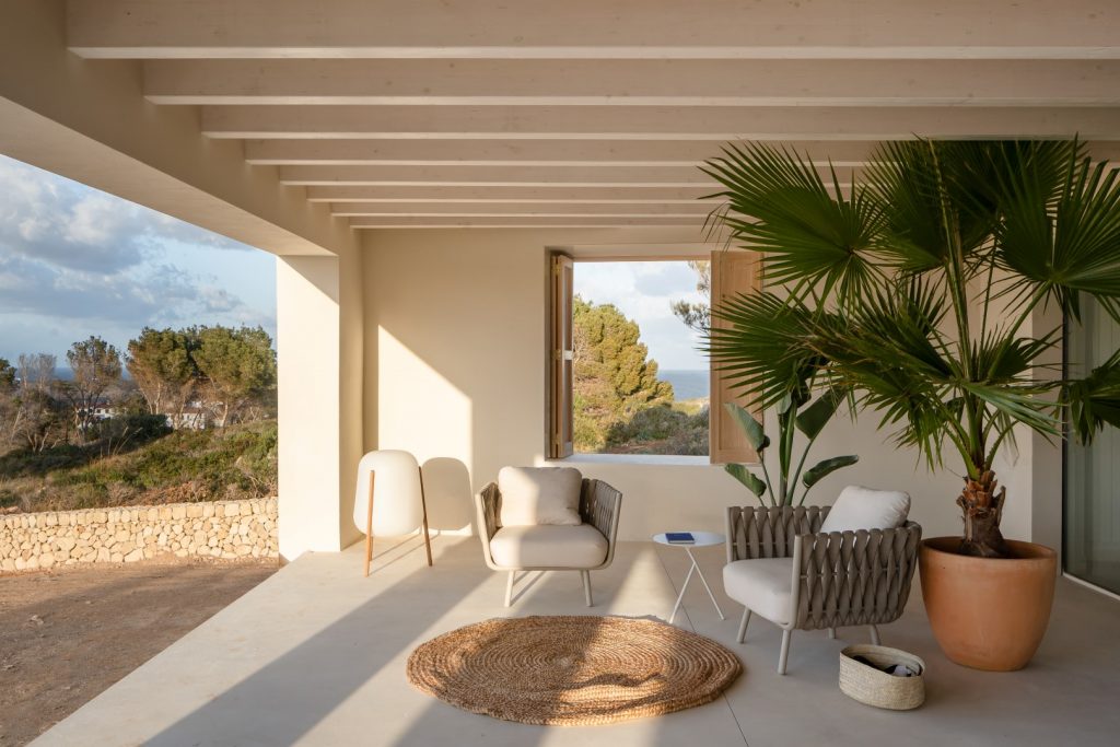 the villa’s circulation spirals around this void liberating it from narrow dark corridors and activating its heart. From its generous 100 sqm covered porch, one can contemplate the most imposing cliffs of Menorca or enjoy its sunsets. This indoor/ outdoor space functions as an extension of kitchen, dining and living room, and is therefore, where most social gatherings take place. It may be also understood as a grand generic space which allows for flexible settings, binds and interconnects the different day areas and acts as a threshold between house and nature. Thanks to this room’s openable double glazed facade it acts as a true thermal buffer becoming a cosy wintergarden in the mild season, a fresh shaded porch in the hot summers and the perfect hot-air insulating system in the winter. In the garden, wild olive trees and local vegetation surround a large limestone platform with a grey stone-coated swimming pool.