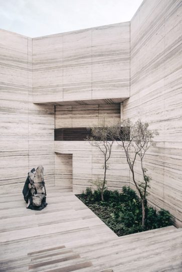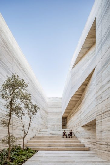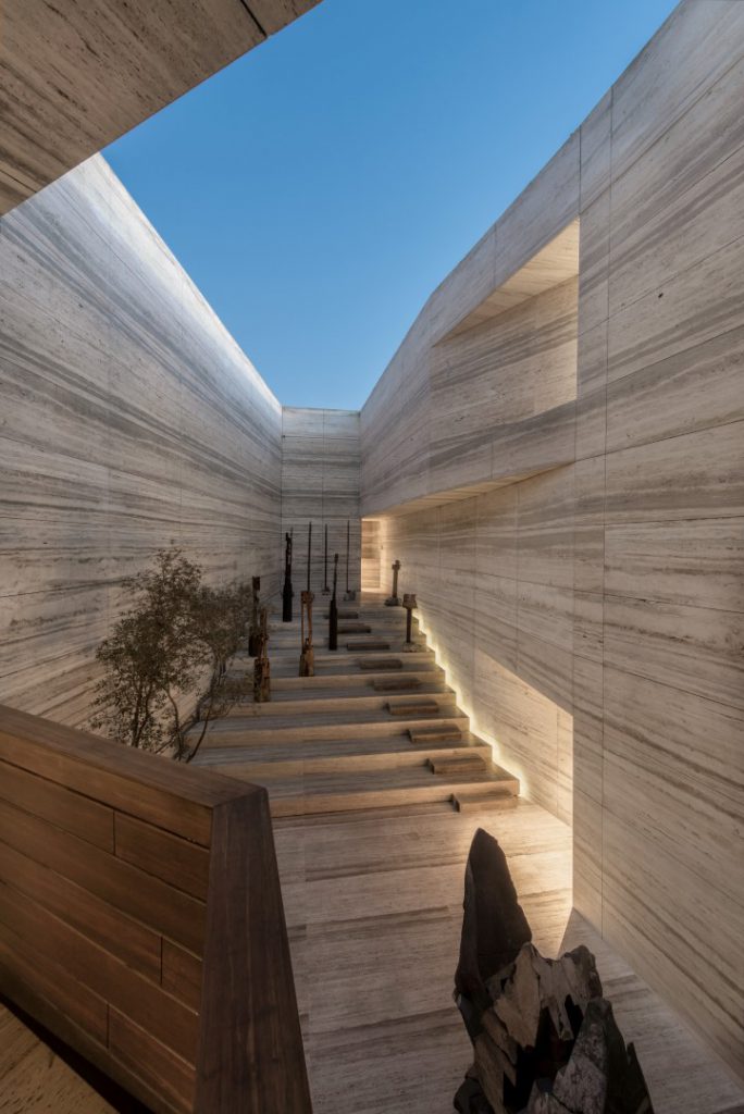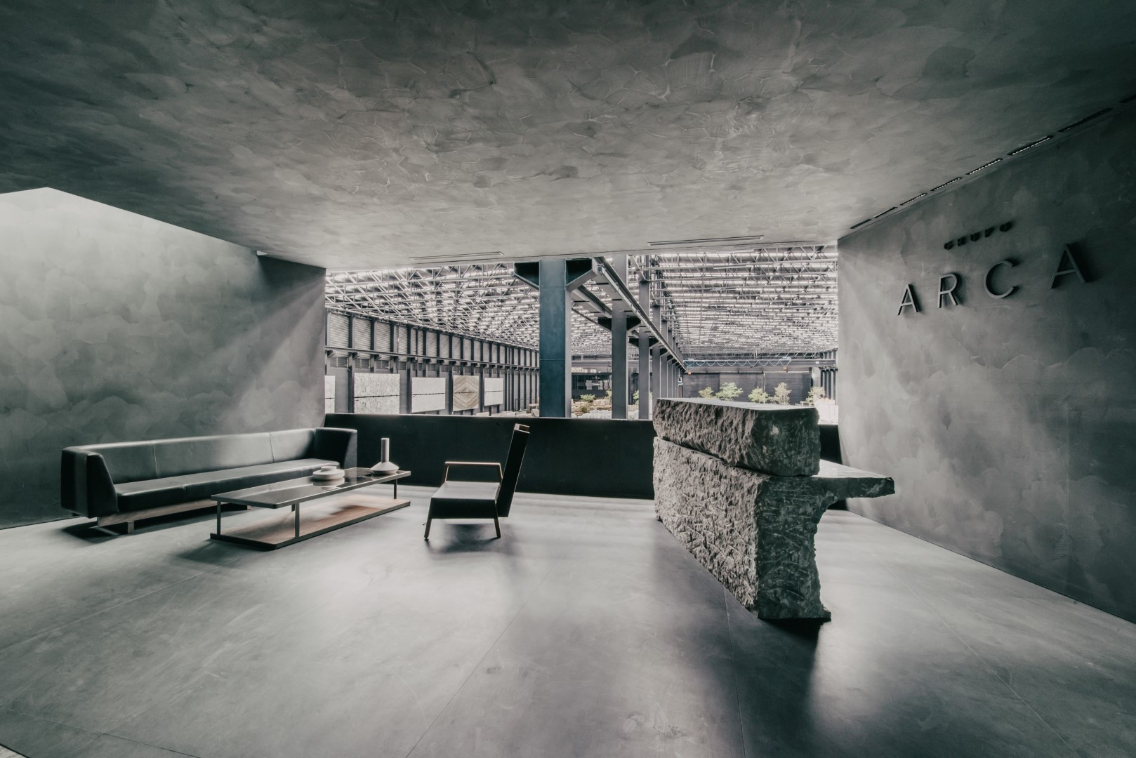 Taş ocakları insanoğlunun tıpkı bir heykeltraş gibi oluşturduğu kıvrımlar ve hacimlerle yer yüzünde bıraktığı jeolojik izlerdir. Hammaddeye ulaşmak için adeta organik bir mimari gibi oluşturulan bu el yapımı peyzaj, bizi maddenin kökenine geri götürür. Taş ocağı kavramı, topografyanın etkileyici ve benzersiz doğasından beslenir. Monolitik cephedeki küçük bir açıklıktan erişim, ziyaretçiyi, anıtsal yapının merkezi olan, “taş ocağına varış” olgusuyla, yani Agora ile ilişkilendirir. Çeşitli özelliklere sahip malzemelerle Agora çevresine eklemlenen çok sayıda sergi salonunu yeni bir müzeografik karakter yolculuğuna başlamak için başlangıç noktasıdır. Giriş, Agora çevresine eklemlenen ve çeşitli karakteristik malzemelerle biçimlendirilen sergi mekanlarına dinamik ve değişken bir deneyim yaşatan müzeografik bir yolculuğun da başlangıç noktasını oluşturuyor. Geleneksel satış mekanlarından farklı olarak biçimlendirilen mekan, hem Meksika’da ve hem de dünyada mimarlık, sanat, tasarım ve kültürün neden ve nasıl üretildiğini sorguluyor. Bilgiyi ve iletişim kurmayı teşvik eden bir platform olarak tasarlanan showroom, toplumla, müşterilerle, firmayla karşılıklı faydaya dayalı bir ilişki kurmanın yanı sıra, Meksika kültürünü ve çağdaş mimari anlayışını tanıtmayı da hedefliyor. Showroom yapısı işlevsel ve fiziksel olarak iki ana kısıma ayrılıyor. Birbirinden hem ayrı hem de ilişkili olan bu iki bölümden biri içinde Agora’yı, Tasarım Merkezi’ni, kafeyi ve çok amaçlı salonu barındırırken, diğer bölümde mekan deneyiminin sona erdiği depo alanı bulunuyor. Bir toplama ve dağıtma merkezi olan depo yarı şeffaf ve tarafsız bir alan oluşturarak ziyaretçiyi maddenin kökeniyle buluşturuyor. QR kodlar aracılığıyla mobil cihazların malzemelerle etkileşiminin sağlandığı showroom’da teknoloji çok önemli bir rol oynuyor. Bu sayede, ziyaretçiler istedikleri malzemelerin ismine, özelliklerine ve maliyet bilgilerine kolaylıkla ulaşabilirken; bu teknoloji sayesinde aynı zamanda, müşteri veritabanının oluşturulması da sağlanmış oluyor.