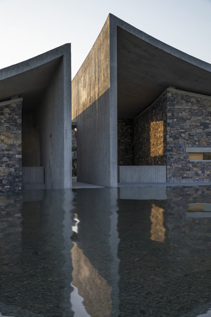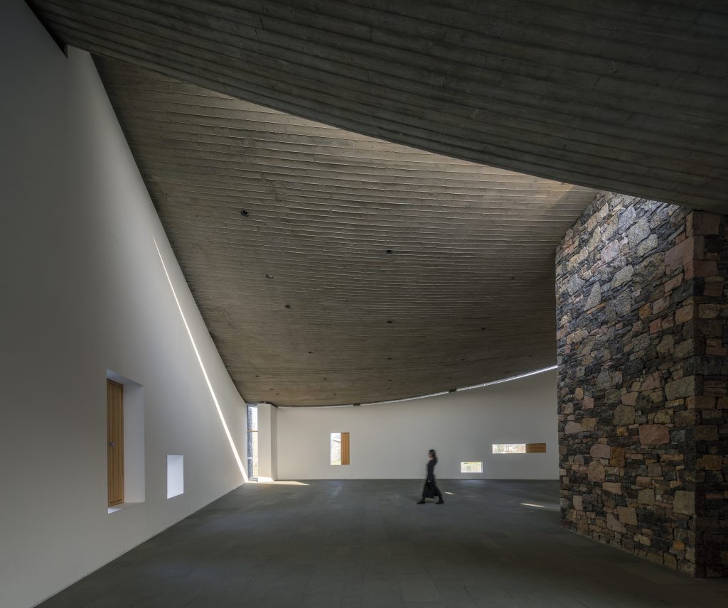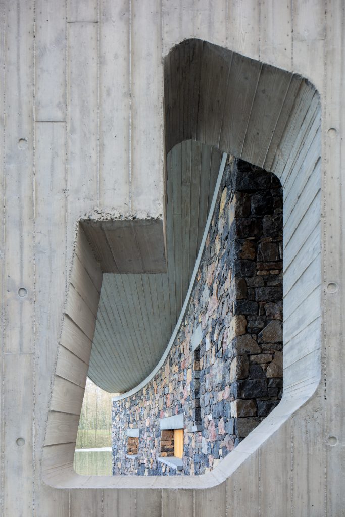 Prominent materials in the architecture include concrete roofing and local rough-hewn stone walls. The hyperboloid roof provides an impressive experience by making visitors feel the inclination of the indoor space towards the ground. The woven stone walls, constructed with local stones, create a texture where traditional and contemporary elements coexist harmoniously.