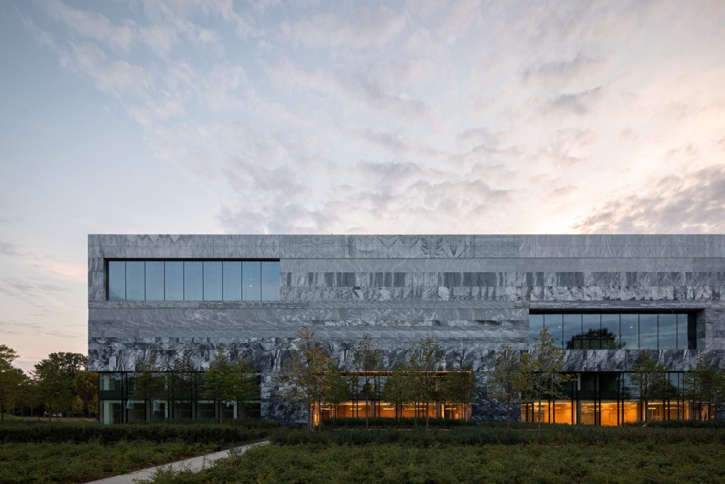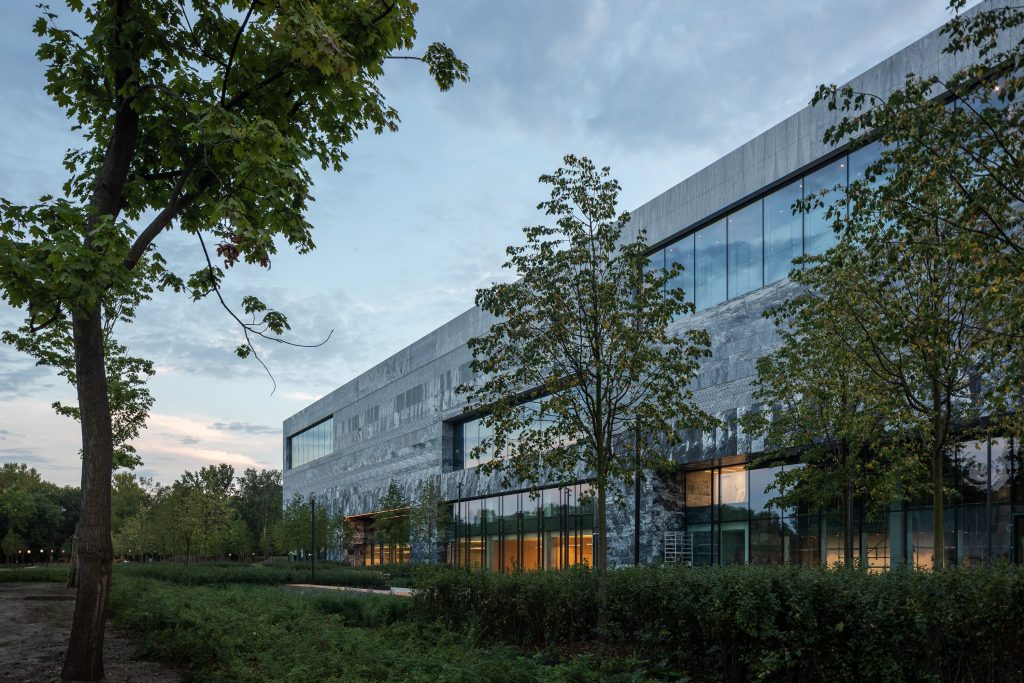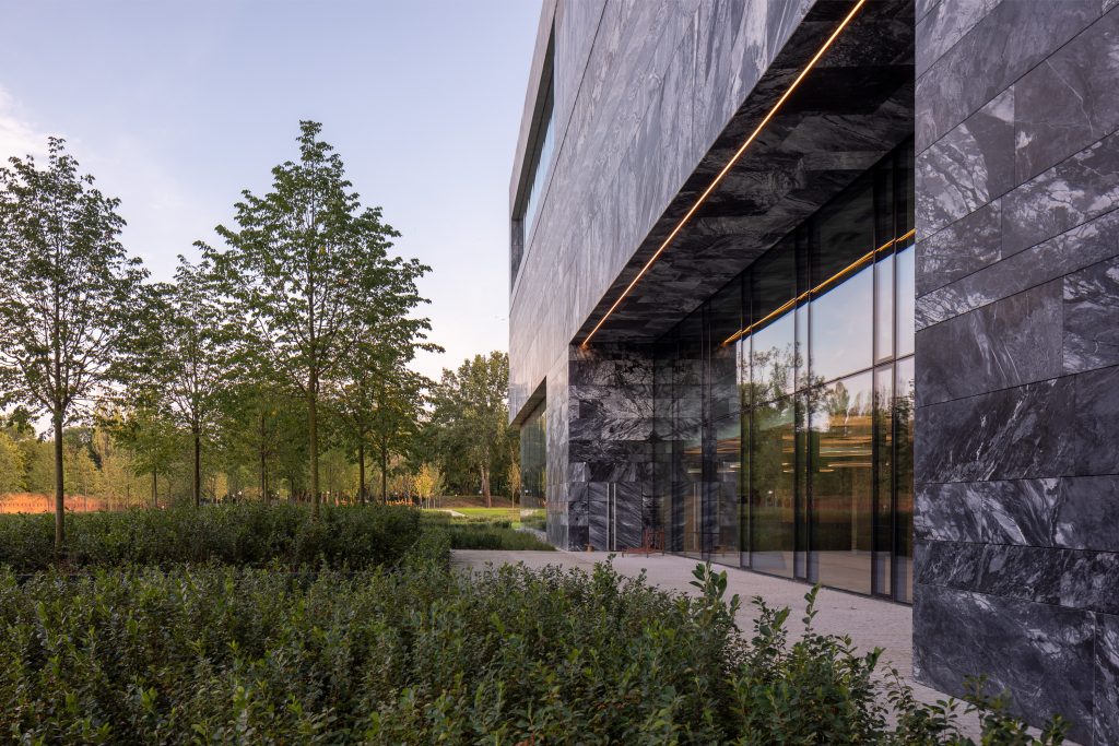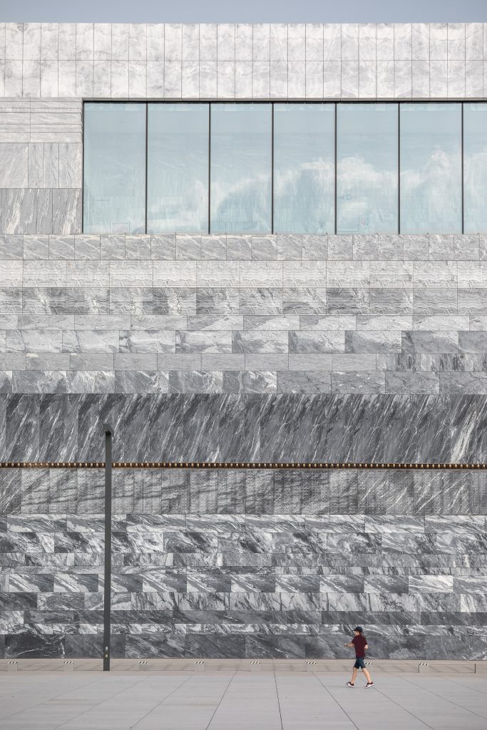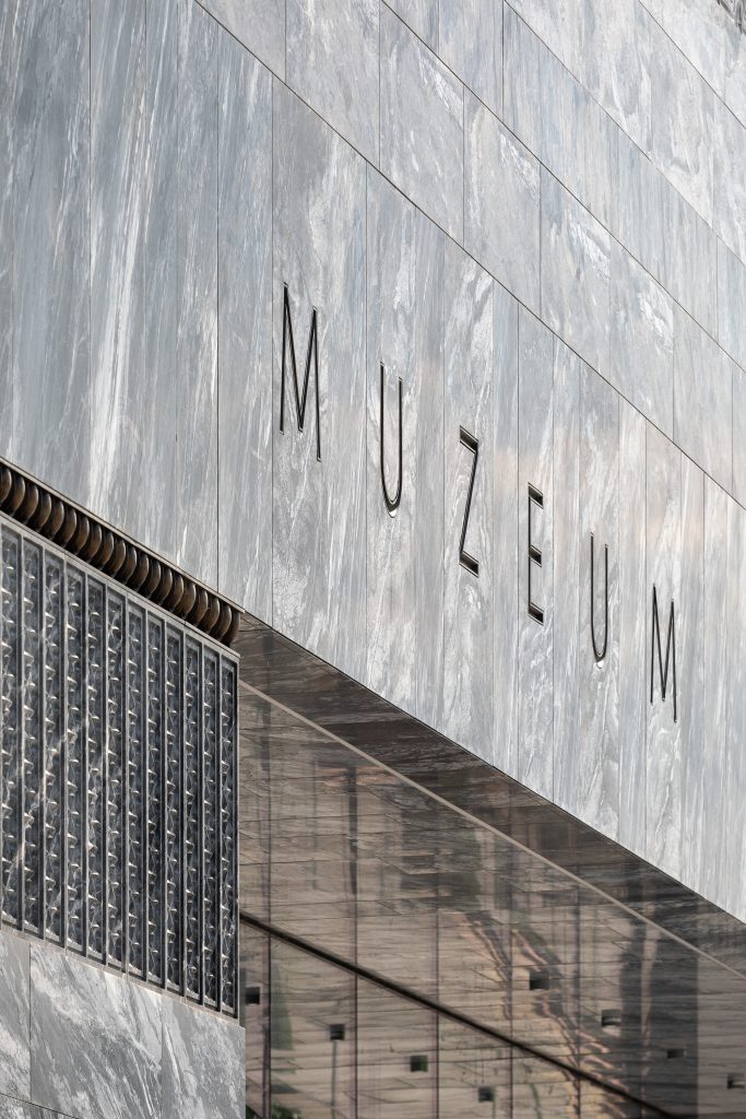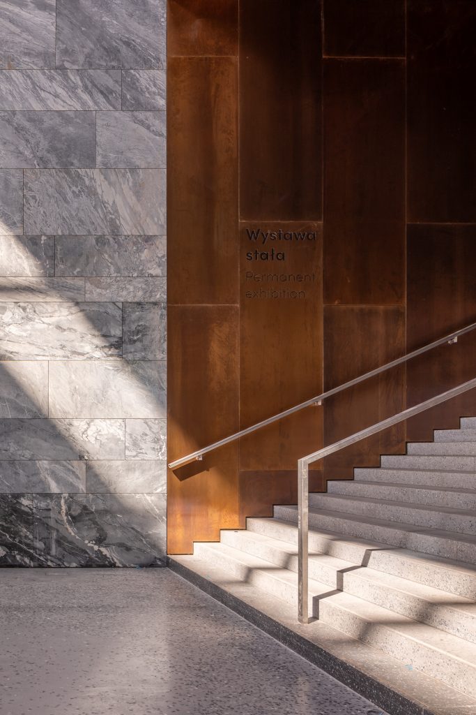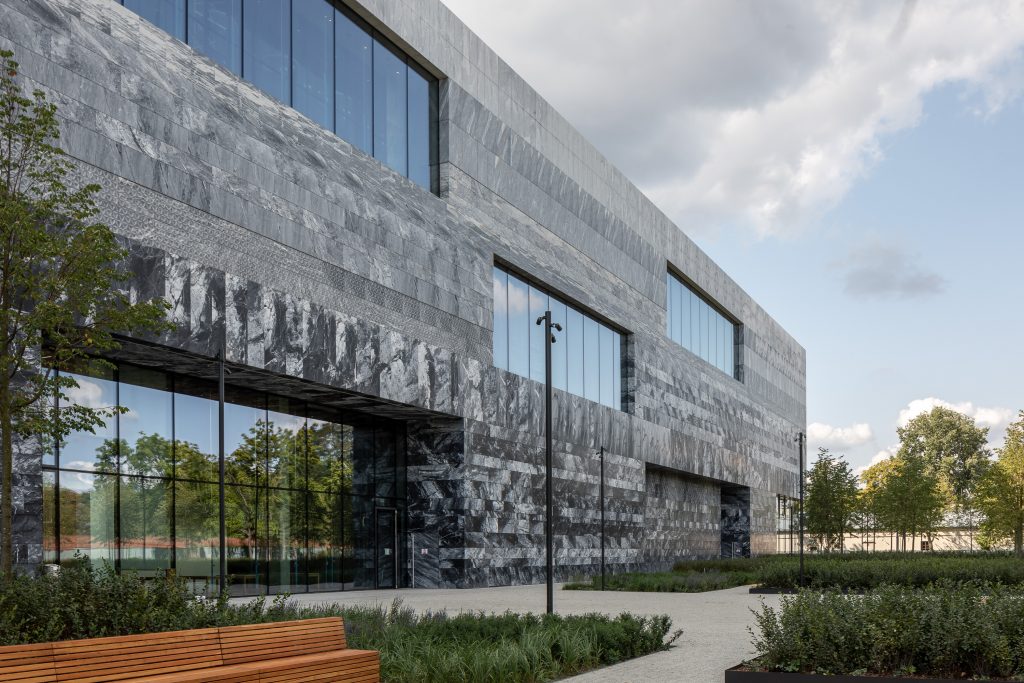 Both museum buildings stand out with their remarkable designs that adopt different profiles in terms of their architectural expression. The buildings stand out not only for their architectural differences and individuality, but also for their originality in form and material selection. While the architecture of the Polish History Museum has a focus on exploring the traces of the past, the design language tells a story shaped through natural stone with a philosophical approach. With its minimalist, monolithic form, the Polish History Museum resembles a chiseled block of stone. The facade of the building is covered with differently patterned stone slabs arranged in horizontal blocks, emphasizing the layered and stratigraphic structure of the stone. The architects decided to use marble because of the stone’s distinctive pattern, emphasizing that each of the marble slabs is different, unique and, like the history of the region, consists of exceptional, distinctive forms and colors.