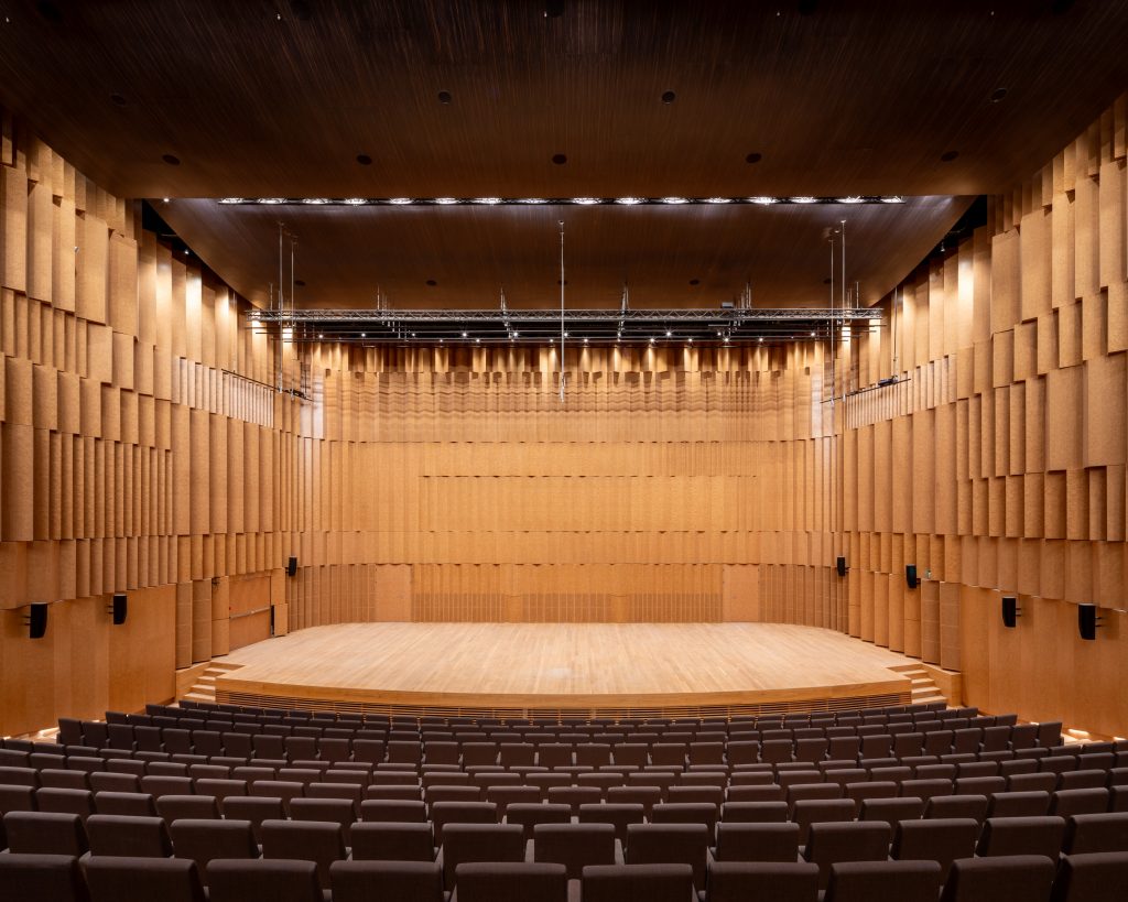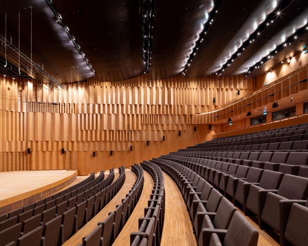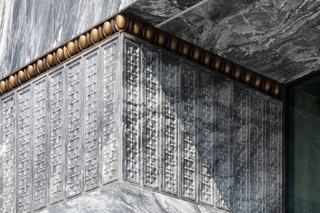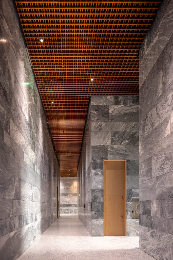 All the stones used in the building are designed as a mirror composition, repeating the slabs. The architects used six different methods to process the stone, creating variations in tone and texture in certain sections. Ornamental details taken from the architectural traditions of the region complement the design. WXCA interpreted these patterns as “artifacts from different periods in a historical cross-section”. The building features spatial graphics with references to the reliefs of the Gniezno Gates, the crystal vaults known from the Gothic period, the decorations of the Chapel of St. Sigismund in Krakow, and the motif of the modernist Spodek Arena complex in Katowice.