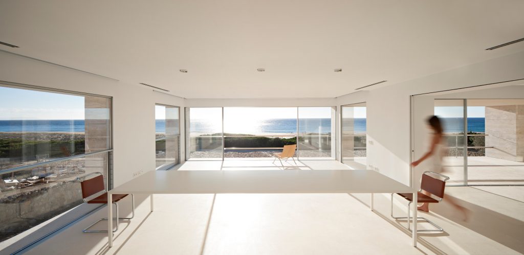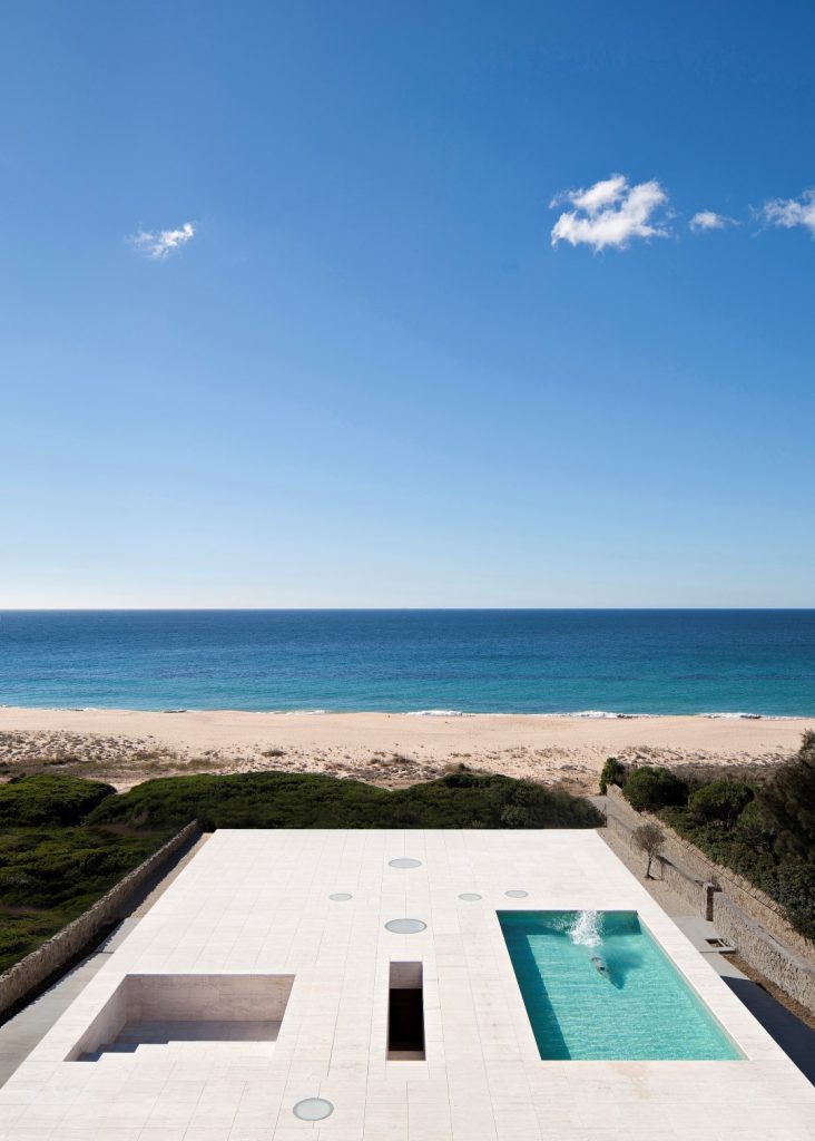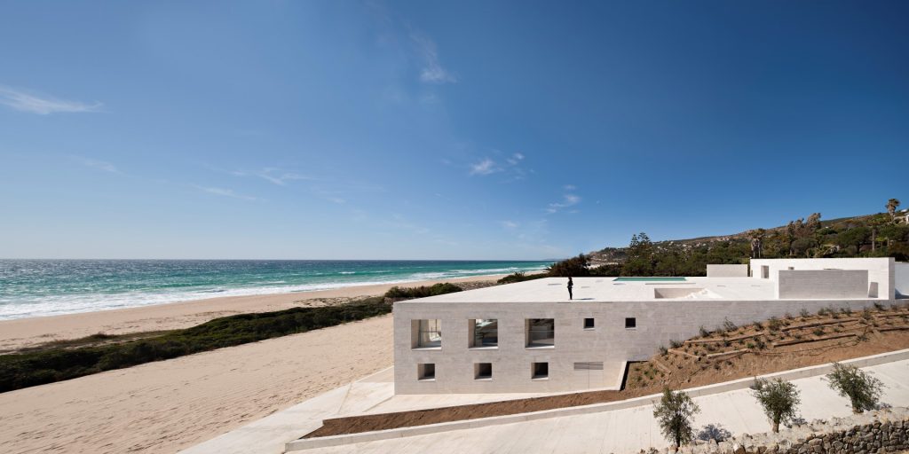 Located in Cádiz, Eternity House aims to provide its users with a timeless experience that leaves a mark. Emerging as a stone platform at the far end of the Atlantic Ocean waters, the building resembles a pier overlooking the vast sea view. The travertine facades of the building, which look like sand, merge with the horizon line on a horizontal plane, creating an endless plane. Built as a large box with a length of 20 meters and a depth of 36 meters, the house was shaped with Roman travertine, referring to the acropolises, as it is very close to the area where the Roman period ruins are located. For the living space, the first 12 meters of which was built underground, 2 layers were dug in the rocky area. In the project, the exterior walls, which look like stairs opening to the upper surface of the house, are also covered with travertine, thereby strengthening the design idea that integrates with the land. The stairs leading to the platform are positioned at the entrance of the building. Located in an area like heaven on earth, where the region is said to be a meeting point where people come together with God, according to mythology, the House of Eternity stops time with its perfect horizontal view.