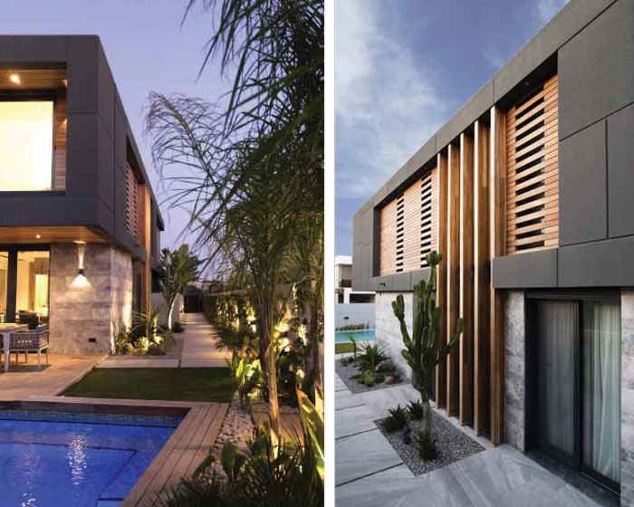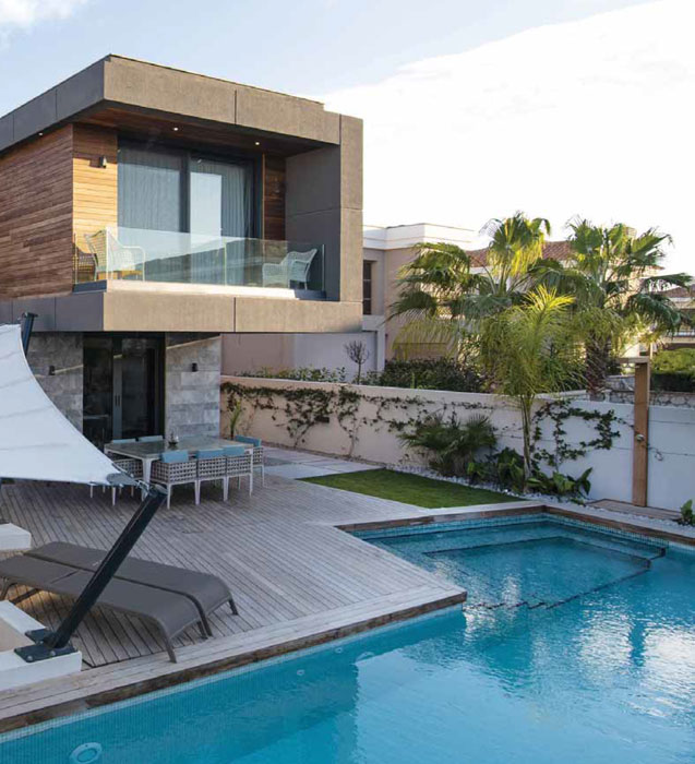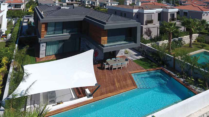 Arsa eni boyunca tasarlanan dar, uzun yüzme havuzu merdiveni ile birlikte bir de jakuzi alanı içermektedir. Villanın mutfağına bitişik bulunan teras haricinde havuza bitişik, bahçe kotundan duşuk bir de “fire pit” bulunmaktadır. Cephe kaplaması icin doğal malzemeler seçildi. Üst katta lineer kütleyi destekleyecek şekilde Iroko cephe kaplaması yatay olarak kullanıldı. Doğal ahşap kaplama banyo ve soyunma odası camlarının onunden de birer sıra atlayarak devam ettirildi. Iroko cephe kaplaması antrasit rengine boyanmış olan oldukca dokulu sıva yuzeyler ile çerçevelendi.