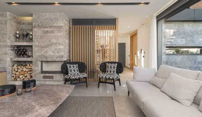 Doğal taşın kendi dokusu ve rengini ortaya çıkartmak ve üst kattaki ahşap bitiş ile tezat oluşturmak icin taşa kumlama ve patine işlemi uygulandı. İki katı birbirine bağlayan merdiven kovası da dış cephede arasında cam olan ahşap dikmelerle gorunur kılındı. Salonun şömine cephesinde ise dış cephede kullanılan Cool Gray mermer, taşa yumuşak bir dokunma hissi icin sadece patine işlemi uygulanarak kullanıldı. Şomine duvarında raflar da doğal taş ile oluşturuldu.