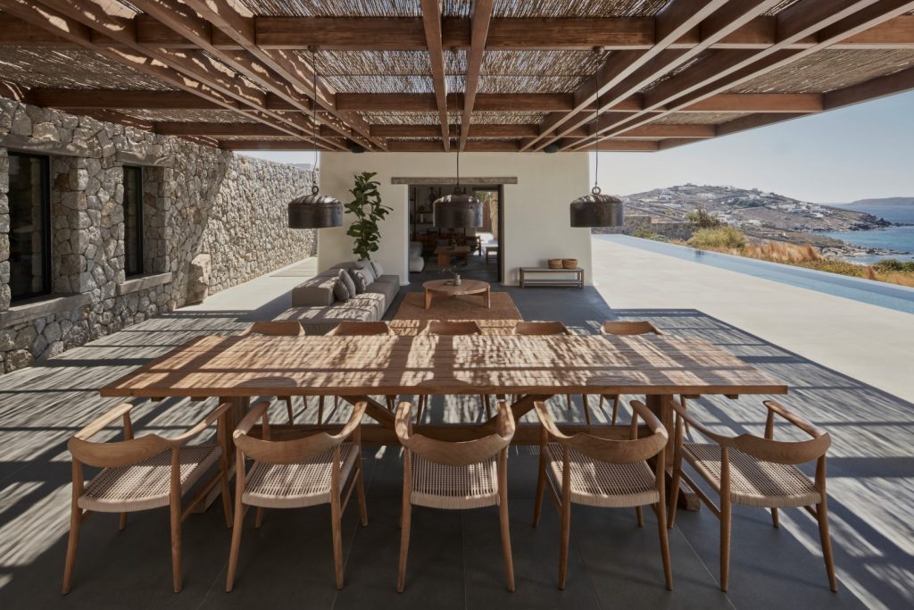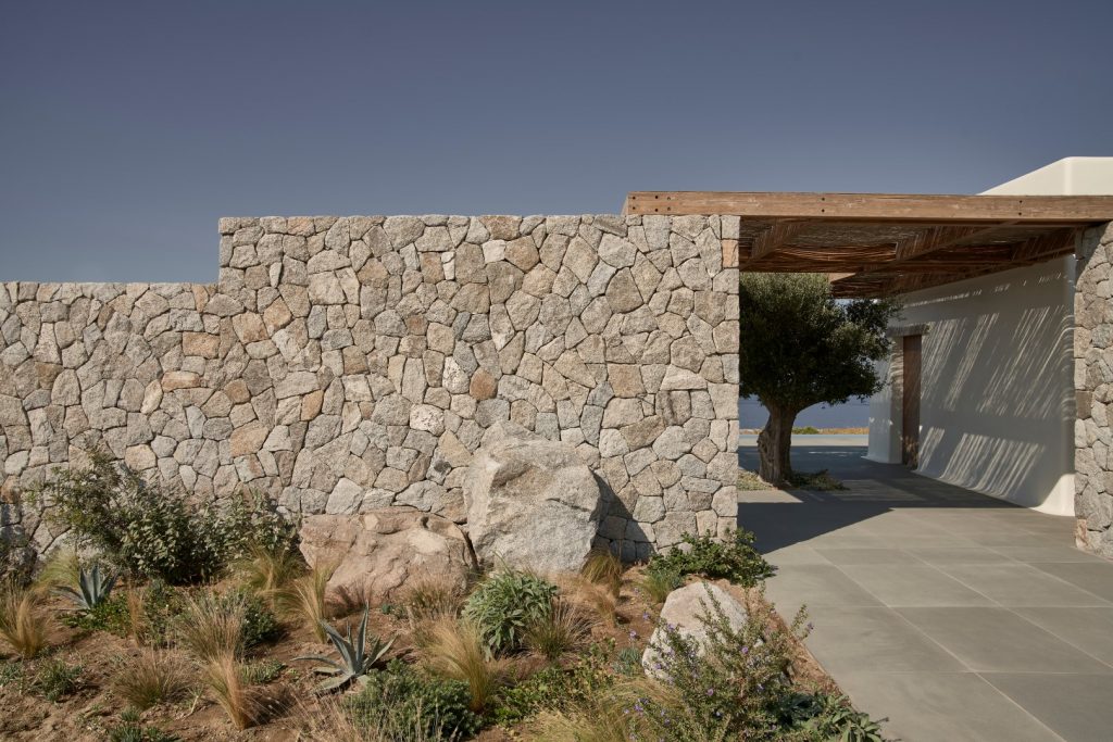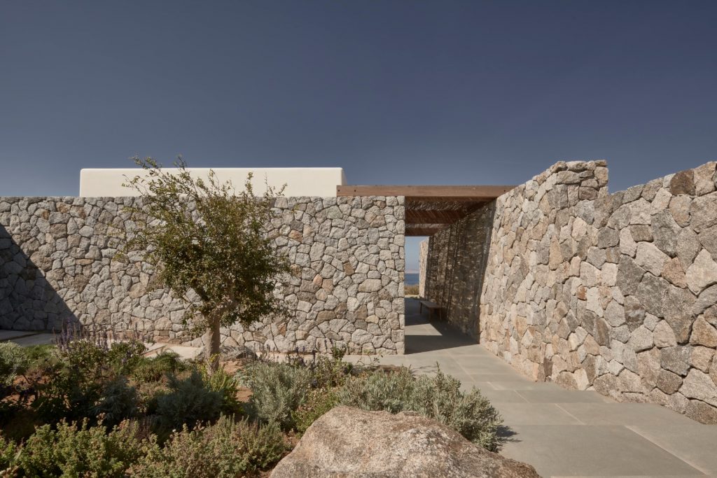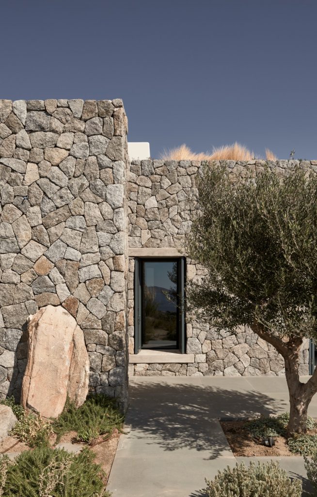 Mikonos’taki Aleomandra tepesinin üst noktasında konumlanan ancak neredeyse manzaradan gizlenen Villa Mandra, doğrudan denize ve komşu Delos adasının gün batımına bakıyor. K-Studio tarafından, kullanıcıların aile ve arkadaşlarıyla vakit geçirmesi için tasarlanan 6 yatak odalı tatil evi, muhteşem manzarayı, hassas bir şekilde düzenlenen taş duvarlarıyla bahçeyle bütünleşmiş bir bakış açısıyla kucaklıyor. Villa Mandra, yavaş, rahat bir yaz mevsimi yaşantısı fikriyle inşa edilmiş ve aile, arkadaşlar ve doğayla iç içe huzurlu ve özgür bir bağ kurmayı amaçlamış. Evdeki her mekan, dinlenme, düşünme ve keşfetme için yeni bir fırsat doğururken, form işlevden ziyade duyguyu izliyor. Kullanıcıların gün boyunca dışarıda olmanın tadını çıkarmasını sağlamak için iklimin yoğunluğunu filtreleyerek gölge ve koruma sağlayan öğeler kullanılmış. Evin çok sayıda konuğa hizmet etmesi beklenmesine rağmen, manzaraya büyük hacimlerle hakim olmaktan kaçınılmış. Geleneksel adanın mütevazi karmaşıklığından esinlenen mimari, geniş ama hafif pergola ile kaplı büyük bir yaşam alanı sunan “avlu”nun etrafından şekillenmiş. Bu avlu, salon ve mutfak hacimlerine kesintisiz biçimde bağlanan ve ötesindeki havuzla bahçeye bakan bir odak haline getirilmiş. Havuzu içine alan bahçenin altında, mahremiyet için ayrılan ve denize doğru kesintisiz manzara sunan sessiz yatak odaları bulunuyor. Yatak odalarının bu şekilde genel hacimlerden ayrıştırılmış olması, evin etkisini daha da hafifleterek sosyal ve özel alanı net bir şekilde bölüyor.