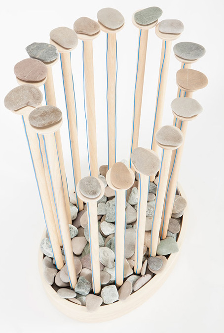“John was considering this as a metaphor of growth: a progression of experiences that affect you but makes you stronger,” Yamamoto said. “This element of growth has a big influence in the design of the object: the wooden stems blossoming from the base of the instrument and the stones positioned in rising heights corresponding to ascending sounds”. Instead of trying to represent different materials, the designers used rounded stones as the keys so they could be played easily”. Apart from aesthetic choices we were also constrained by the fact of the object being playable, and this kind of rounded stones were the most suitable for that goal, without needing to modify their shape,” Yamamoto said.