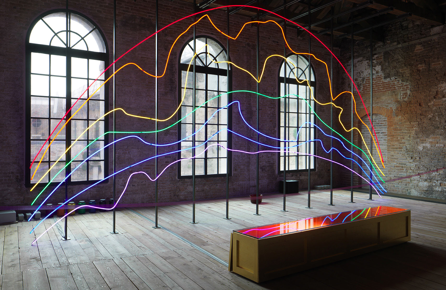 “Respiro”, meaning “breath” in Italian, is complemented by a musical composition by Jacopo Baboni-Schilingi, which is based on the artist’s rendering of the rainbow’s seven colors as a system of partitions. The music is played day and night, together with the neon works breathing in and out for the duration of the exhibition. Respiro took its first breath on 3 April and became fully alive on 23 April 2015.
