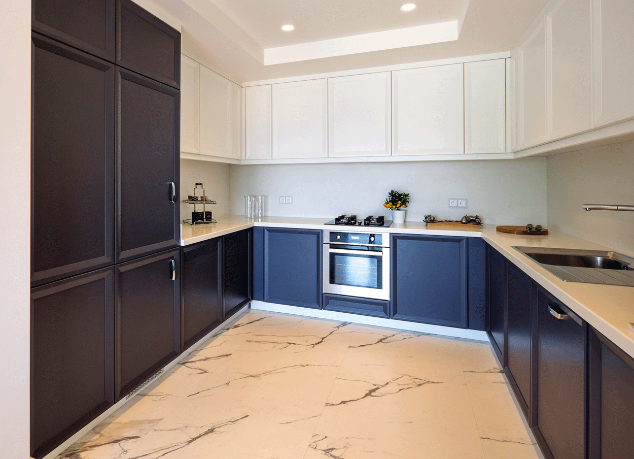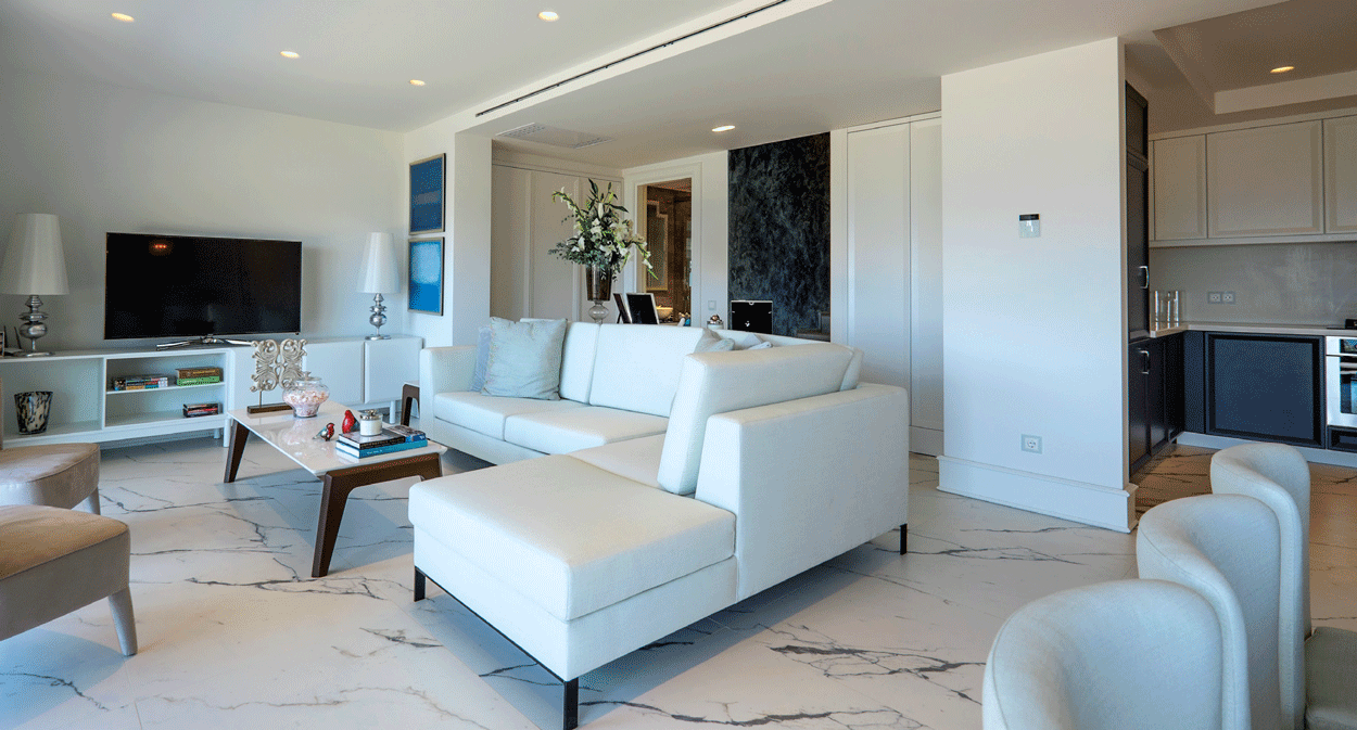 Qualified and elegant materials shine out in all the villas of the project. Large white stones with gray grains are used on the floorings. These are at classical sizes and serve to the broad spaciousness when they are scaled up in size.