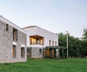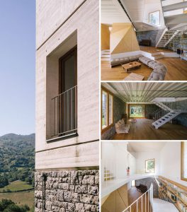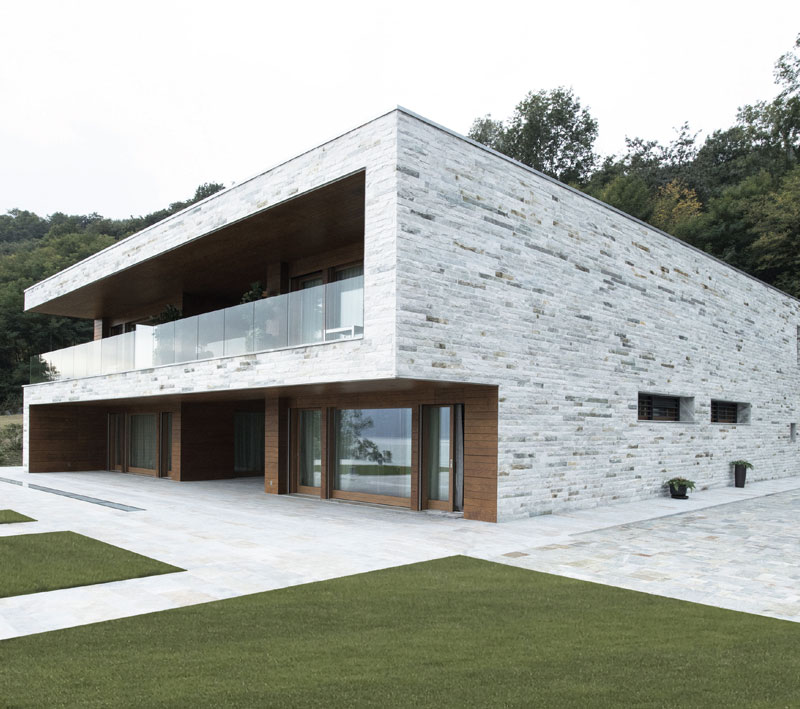 The house designed by Camillo Botticini with Mauro Sillani sits on the western shore of Lake Orta. Located in the vicinity of Pella, a small town in the province of Novara which is known for its scenic areas and natural environment, the project overlooks the island of San Giulio with high hills rising right at its back. Botticini makes the following remarks regarding the house with such strong qualities, which has been designed in detail and equipped with a bold and linear profile: “The house looks like a block of stone that has stopped after sliding down from the mountain top. During its fall, the mass has opened up with the cavities inside almost facing the crystal clear waters of Lake Orta, virtually touching the beautiful island of San Giulio.” These cavities or “wounds”, have become the sounds that soften the rough appearance of the construction; these wounds “heal” so as to create generous openings onto the lake view, catalyzing the natural light inside what was initially only a stone box. Therefore the house becomes the fruit of a transformation from stone to architecture; it holds its ground as an element of nature while being able to house people and residential activities… The farmhouse, which was untouched for over fifty years, was calling for a complete renovation to be adapted for contemporary needs. There were two construction sites including the main house and a stable. The main house was overgrown with vegetation and in a very bad condition. Numerous repairs had to be made to make it livable. The timber and stone structure of the stable was substantially deteriorated and most of the walls had to be replaced. Considering the farm’s bad condition, the positioning and significance of the architecture was maintained; the new facade of the main house was reconstructed with white concrete and local stone. The insulating lining implemented in the main house formed the new loadbearing structure, strengthening the old stone walls while also providing thermal insulation. Previously made of stone and brick weatherboarding, the facade parts were replaced by a monolithic wall of insulating concrete with formwork, which regenerates the old texture of the timber. Windows were placed in deep recesses and behind large wooden shutters, giving reference to the style of stable doors. Positioned on a steep and sheer mountain slope overlooking the valley, the main house articulates to a site having a 2 meter difference in level between the north and the south facade. The gradual layout of the ground floor levels in harmony with the slope of the land, provides a series of connected areas abstaining from traditional interior sections. In the interior, retaining walls were replaced by light metal columns, forming a large triple-height living room along the entire length of the structure, which allows daylight to penetrate in. A generous metal staircase provides access to the different rooms of the house. A worn-out stone made of a mix of white concrete and iron beams coexist with weather-beaten wood and local stone. The interior space is organized around four diamond-shaped elements that stretch vertically from inside the house. The elements that present this holiday home with its character are inspired by the client’s four daughters. The first floor contains two bedrooms connected through a double-height space overlooking the valley, along with the master bedroom opening out on the corner terrace. In the stable, the haylofts on the upper floor were transformed into bedrooms emancipating the space on the ground floor with an aim to create a large central hall that serves different purposes