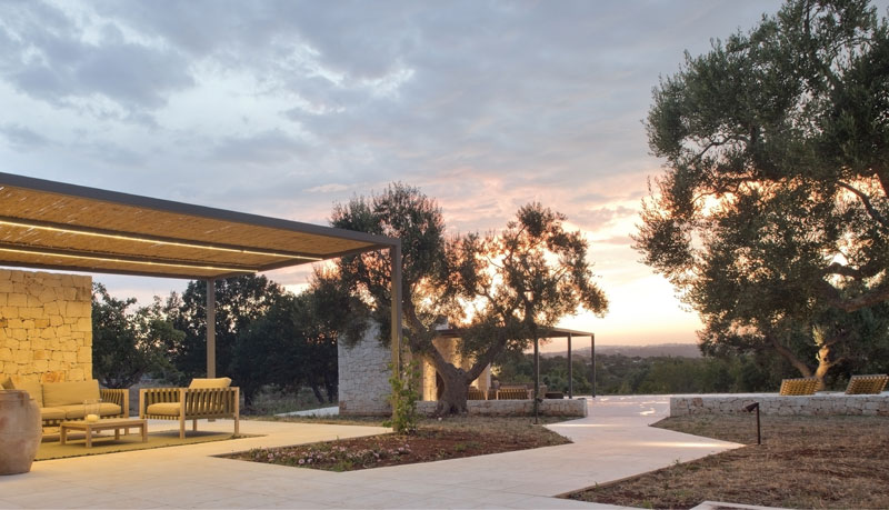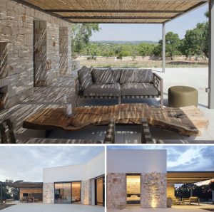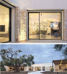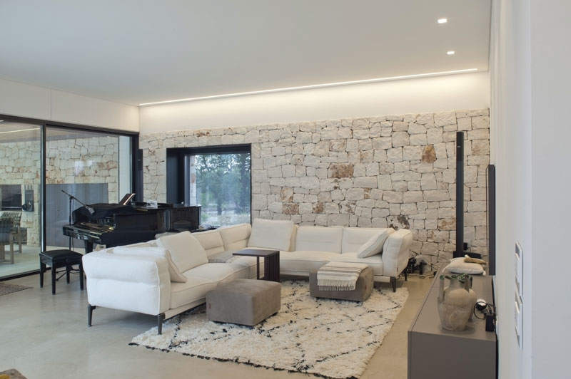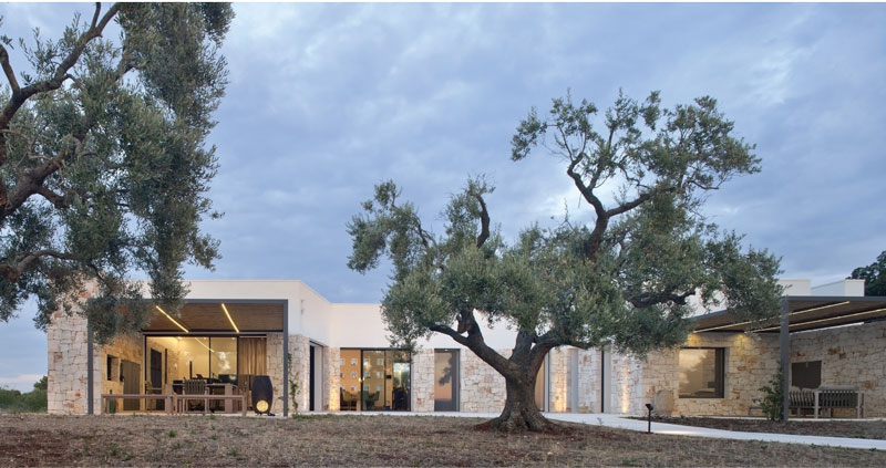 Located in Valle D’Itria of the Ostunia countryside, this smart and connected house is designed to work and relax. The house is reinterpreted with the traditional forms and materials of the rural areas of Puglia, while the automation technology provides complete control through the Smart Device app and optimizes energy consumption. An important German manager and their spouse have chosen Puglia to live, work and think. Situated at the rural part of Ostuni, the land holds an elevated ground and has an inviting landscape covered with beautiful olive trees. The project set out with the idea of a central patio that would ensure passive protection from the sun in the warm southern Mediterranean climate. The house is formed around a C-shaped patio, while the north-facing wide windows are used to protect from the Pugliese sun and to enjoy the view. The east corner houses a living area and studio for the homeowner along with a kitchen and dining area for his wife, while the west corner embodies a studio and a master bedroom. The west end embodies a guest room with seperate entrance and services. The swimming pool, gazebo and sauna positioned in front of the porch at the northern facade of the house, overlooks a green landscape. The finishing materials indigeneous to Puglia are rendered into a contemporary character thanks to architectural details; the project features drywalls and lime plaster for walls, oak for minimal window frames and Apricena stone for claddings. Upon the request of homeowners, the house is equipped with the KNX home automation system, which works through a web server connected to the network in order to remotely control the functionality of the house via apps present in smart devices. The entrance and the video door-phone, security and alarm systems, air conditioning systems and all of the lighting elements are being controlled by the home automation system. The energy saving is achieved through integrated heat pump system, solar panels, photovoltaics, charging stations for electric vehicles and consumption monitoring.