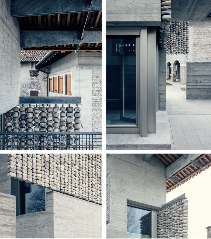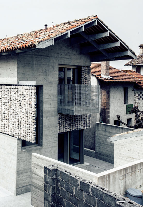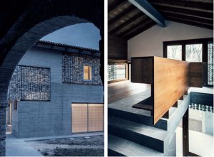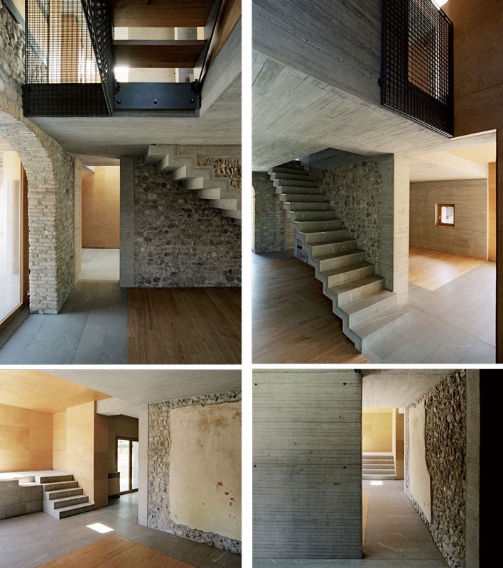 concrete emerge in different shapes from the exterior of the building. Somewhere they protrude through the original walls, elsewhere they remain within the perimeters of stone walls or occupy the portico. The reconstruction of the house 2 had to comply with the building code, which is applied for all the interventions in the historic centers, enabling the use of stones in traditional shapes and forms in order to prevent the loss of identity of small-scale rural areas. While the shape of the house is defined by reinforced concrete slabs, the traditional stone is reinterpreted in a “cosmetic” use, thus overthrowing the hierarchy of the main building. Both houses have a concrete structure – reinforcing the old stone walls – which respond to the needs of a highly risky seismic area. The buildings are defined by a highly insulating envelope and low-energyconsumption systems (heat pumps). The insulating layer is situated at the inner face and finished with drywall or wood panels that alternate with the cold appearance of the concrete and stone walls. The large openings facing south and west in house 2, provide shade through “curtain stones”, which create special lighting effects when the sun goes down… CREDITS