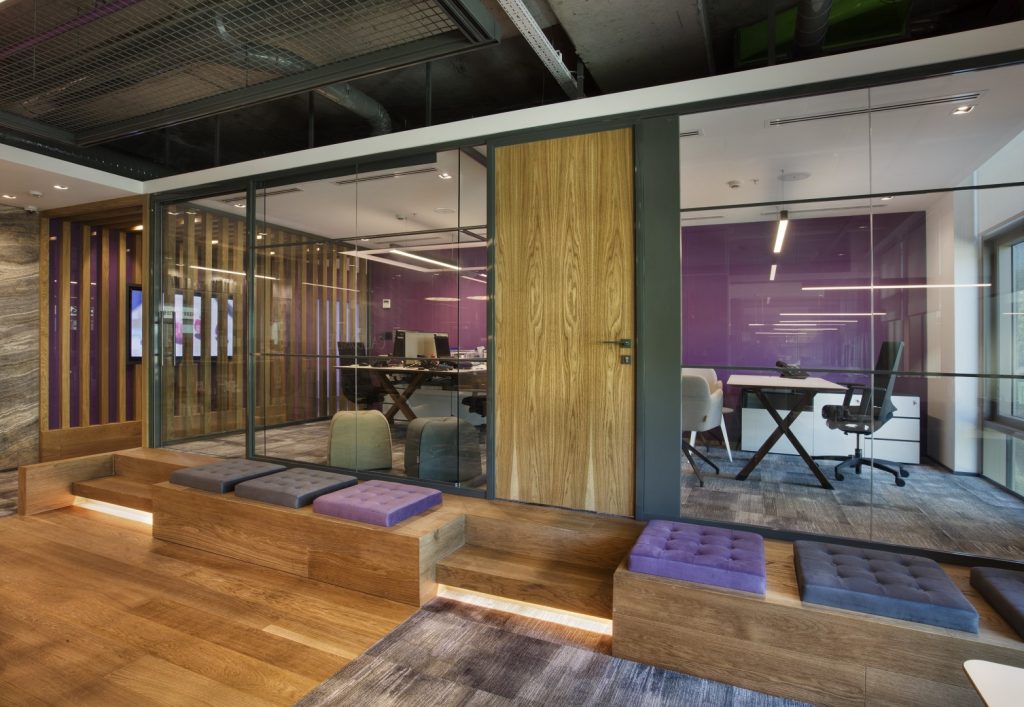 düzende kullanılmış, kapalı odalar ise sadece cam bölücülerle ayrılmış. Ofisin