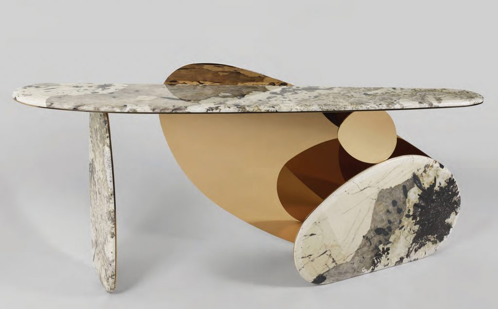 Taher Chemirik’in masa tasarımı Pathway, cilalı bakır kaplı pirinç boru ayaklar ile nadir bulunan bir doğal taş olan sert pinolitten üretilmiş tablaların birleşiminden oluşuyor. Her biri el yapımı olan iki masa, rafine ve dramatik bir tasarım anlayışı ve heykelsi bir estetikte biçimlendirilmiş. Chemirik, dekoratif sanatların zarif işçiliğini çağdaş bir anlayışla yorumlarken mücevher tasarımcılığından gelen tecrübesini büyük taş parçalara uygulamış. Doğaya olan sevgisi ve kişisel dünya görüşü, Chemirik’in şiirsel bir estetiğe olduğu kadar fonksiyonel bir strüktüre de sahip olan heykelsi objeler yaratmasını sağlıyor.