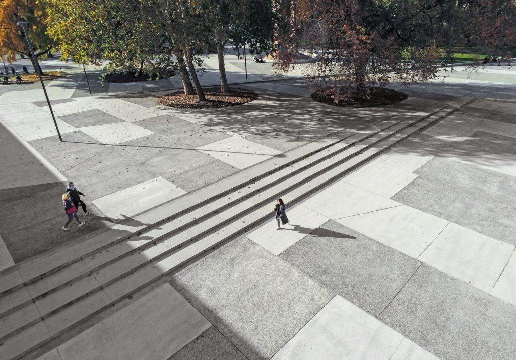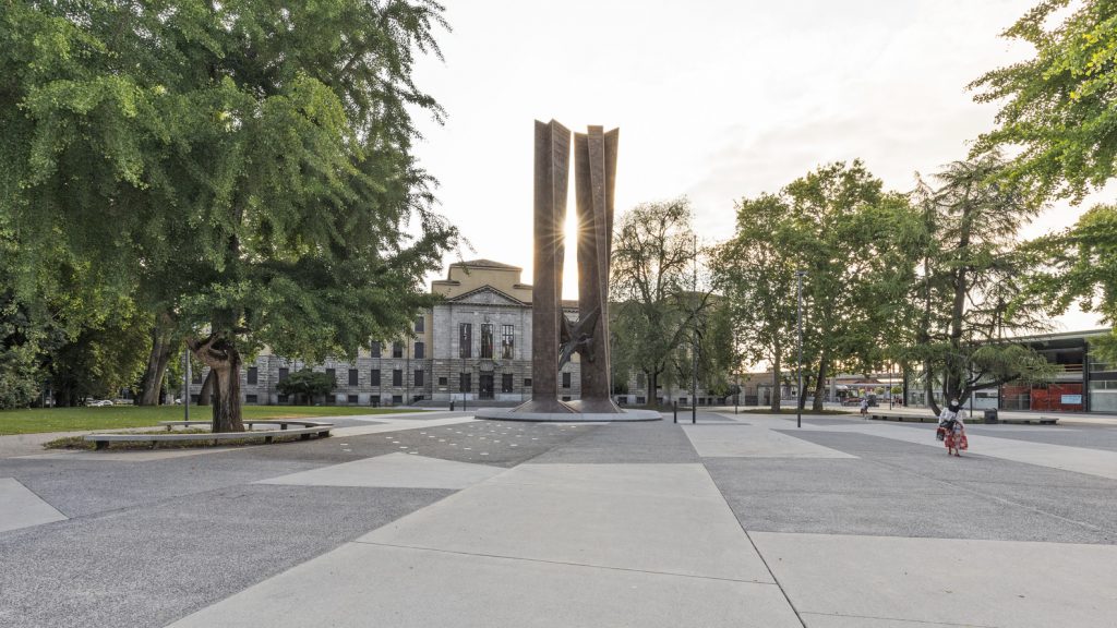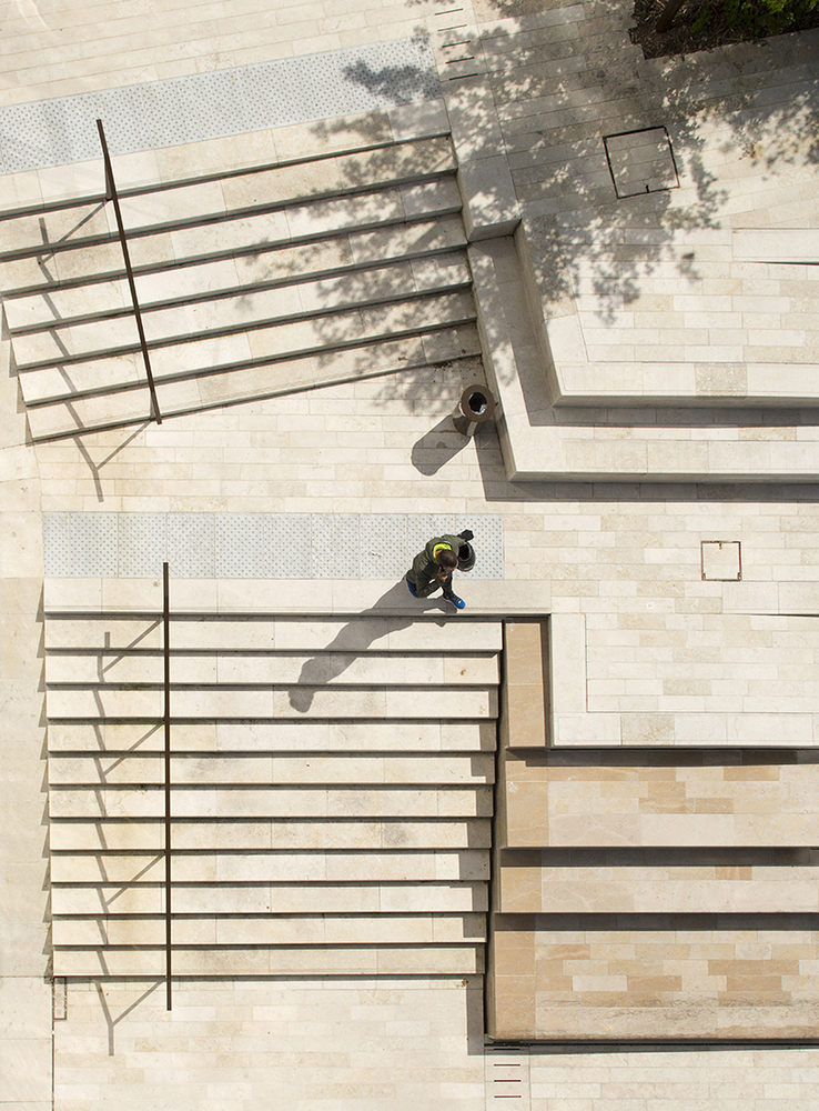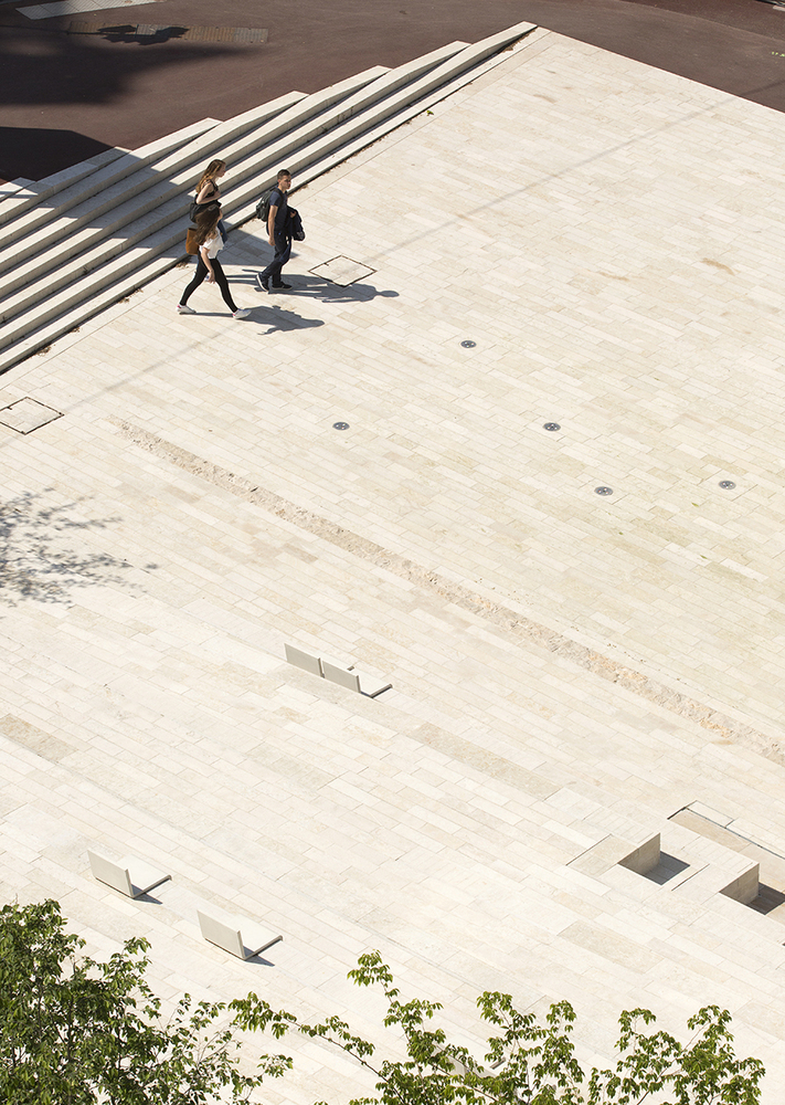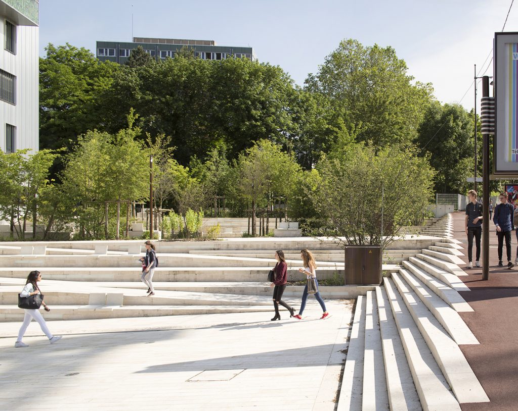 Yeni bir yerleşim bölgesi olan Châtenay-Malabry’nin girişinde, stratejik bir konumda yer alan meydan, çevresindeki kavşaklara net bir görüş sağlarken bölgede yeni açılan Eczacılık Fakültesi’nin gelişiminin duyulmasına da katkı sağlamayı amaçlıyor. Projede, arazinin jeotopografik özellikleri, yoğun trafik yollarının kesişme noktasındaki konumu ve 5 metrelik kot farkı peyzaj planını belirlerken çok sayıda bitki, çeşme ve oturma yeri barındıran üç yatay teras yaratılmış. Bu teraslarla farklı kotlardaki bina girişlerine erişim sağlanmış. Meydanın ana cadde kotunun altında olmasıyla, yolun her iki tarafında görsel süreklilik sağlanırken trafiğin yoğunluğuyla ilgili oluşabilecek rahatsızlıkların da önüne geçilmiş. Basamaklar, rampalar ve teraslar ve bitkilerden oluşan meydan zemini doğal taş biçimlendirilmiş. Bu yeni topografi, farklı kullanımlara imkan sağlarken tüm yaya hareketlerini bütünleştirip erişim kısıtlamalarını ortadan kaldırıyor.