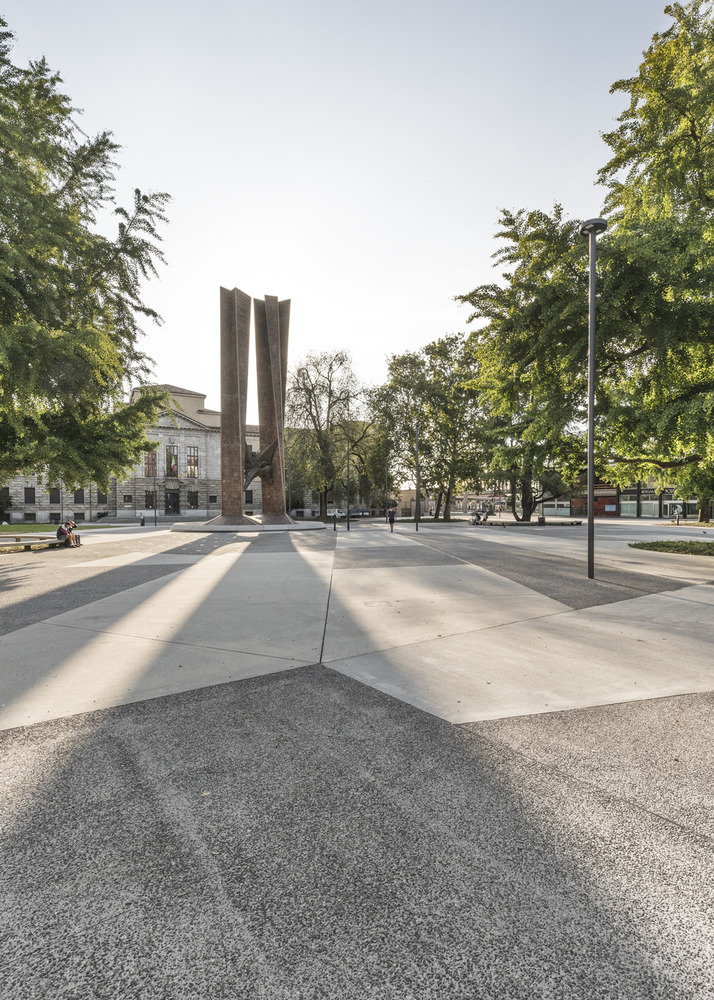 Alpini meydanının yenilenmesi projesi, 2018-2020 yılları arasında Bergamo Belediyesi adına Studio Capitanio Architetti ve OSA Architettura e Paesaggio tarafından gerçekleştirilmiş. Kentsel dönüşümün merkezinde, şehri tanımlayan kamusal alanların yeniden geliştirilmesi yer alıyor. Kısıtlı bütçeli proje, şehrin en büyük açık alanının kolektif boyutunu kurtararak, toplumun kıyısındaki bireylerin ve meydandan kayıtsız geçenlerin aceleyle uğradığı bu merkezi alandaki sosyal sorunları çözmeyi amaçlıyor. Meydan, 1960’larda Mimar Gambirasio tarafından tasarlanan Alpini Anıtı ve görkemli ağaçlarla zenginleşen tarihi cadde üzerinde konumlanıyor. Yeni meydan, şehre aidiyet duygusu kurabilen, geniş, rahatça erişilebilen bir alan olarak hayal edilmiş. Açık ve güvenli alanlarla tasarım, özgür manzaralar, etkinlikler, açık hava sinemaları, geçici gösteriler ve yerel pazarlar gibi yeni kentsel davranışların hayata geçirilmesine olanak tanıyor. Meydanın bütünsel görünümü yoldan geçenlerin dikkatini çekerken, güvenlik ve konforu da artırıyor. Ziyaretçileri meydanın merkezine yönlendirmek için, bir rampa ve merdivenler oluşturan dikkatli bir kompozisyon düzenlenmiş. Kaldırımlar yerel çakıl ocaklarından çıkarılan agregalarla vurgulanırken alternatif bölümler cilalı taşlar ve brüt betonla tanımlanmış. Büyük ve tarihi ağaçların sergilendiği meydanın tasarımı özgün tasarımlı banklarla tamamlanmış.
