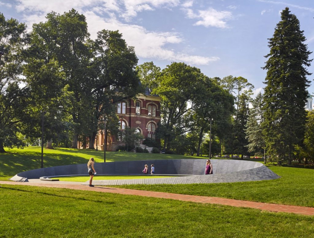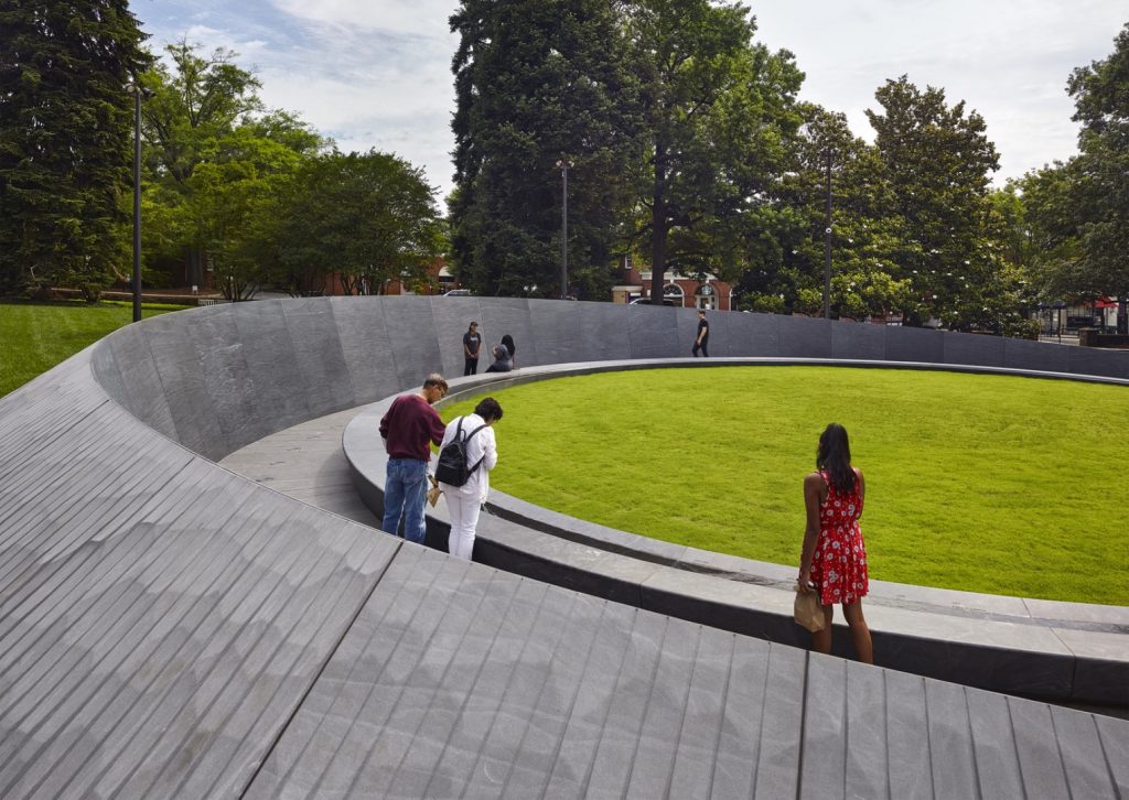 Höweler + Yoon Architecture imzası taşıyan Köleleştirilmiş İşçiler Anıtı, Virginia Üniversitesi’nde günlük yaşamını sürdüren Afroamerikalı öğretim üyelerinin, öğrencilerin ve yöneticilerin yaşamlarını, emeğini ve azmini onurlandırıyor. Anıt, 1817 ve 1865 yılları arasında üniversitenin yapımında çalışan 4.000 kölenin hissettiği, esaret acısı ve geleceğe dair umut duygularının zıtlığını yansıtmayı amaçlıyor. Tasarım, bu insanlık dışı şiddete karşı beslenen direnci kutlarken topluluğun mücadeleye katkılarını anlamak, öğrenmek ve hatırlamak için bir kamusal alan hizmeti sunuyor. Charlottesville şehir merkezine bağlanan Üniversite Caddesi’nde yer alan anıt, kuzeye, simgesel özgürlüğe doğru yönelerek gerçeği ve adaleti arayanlar için açık ve davetkar bir alan sunuyor. Tasarım, Afroamerikalıların özgürlüğü kutladıkları danslardan ilham alınarak dairesel formla inşa edilerek dört bir yandan daha fazla ziyaretçiyi kucaklamayı hedefliyor. İçerisinde bir buluşma alanı, zaman çizelgesine sahip bir su tablası ve yerel granitle biçimlenen, topluluktaki isimlerin kazındığı dışbükey eşmerkezli halkalardan oluşuyor. 80 fit çapındaki granit dış cephe, çeşitli yüzey dokuları, kaplamalar ve portrelerle köleleştirilmiş emekçilerin deneyimlerini yansıtırken; iç duvar, her bireyin isminin yer aldığı bir arşiv işlevi görüyor.