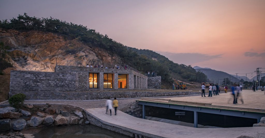 1990’lardan bu yana, Çin’in hızlı kentleşmesiyle birlikte Weihai kentinde çok sayıda taş ocağı keşfedilmiş. 3andwich Design / He Wei Studio, devletin çevre korumasına verdiği önemi artırması üzerine kapatılan ve atıl kalan taş ocaklardan biri olan bu alanı, yerel halkın yararına olacak bir kamusal mekana dönüştürmek istemiş. Alan araştırması sırasında tesadüfen bulunan “Shi Wozi” (Taş Yuva) olarak adlandırılan küçük boyutlu taş ocağının çekiciliği, tasarımcıları kendine hayran bırakırken yıllar süren erozyondan sonra kavisli bir el formuna bürünen taş ocağının hangi kamusal işleve hizmet edeceği, projedeki en büyük soru olmuş. Mimarlara ilham kaynağı olan Antik Yunan amfitiyatrolarına analojik bir yaklaşımla, bir açık hava tiyatrosunun kamusal bir alan olarak, toplantılar, müzik ve tiyatro festivalleri için halka açık bir iletişim meydanı olarak kullanılması hedeflenmiş. Taş ocağından kalan yay şeklindeki çukur, amfitiyatronun akustiği sağlayan arka duvarı olarak herhangi bir işlem görmeden korunmuş. Taş ocağının çukur formlu duvarı, performansın en önemli içeriği olarak, sahnenin sadece arka duvarı değil aynı zamanda en önemli sanatçılarından biri olmuş. Sahnenin yatay düzleminden başlayarak hafifçe yükseltilen ve sahneyi saran seyirci alanı ile sahnenin formu, simetri gözetilmeden orijinal araziye göre uyarlanmış. Seyirci alanının altına, depo, tuvalet ve kafe gibi işlevlere hizmet eden mimari bir yapı eklenmiş. Yapı malzemesi olarak arazideki kazıdan elde edilen taşlar kullanılmış ve cephede Fransız pencereler ile düzenli görünüm kazandırılmış. Binanın iki yanına, sahne alanına giriş çıkış için düzenlenmiş, etrafı yüksek ve büyük duvarlarla çevrili dolambaçlı basamaklar ve rampalar yerleştirilmiş. Arazinin tarihini yansıtan bir mağara hissi yaratan proje, peyzajı mimariyle harmanlıyor. Terk edilmiş endüstriyel kalıntılar üzerinde kültürel konsept çözümleri üreten tasarım, bölgedeki kamusal alan eksikliğini uzun vadeli gidermeyi amaçlıyor.