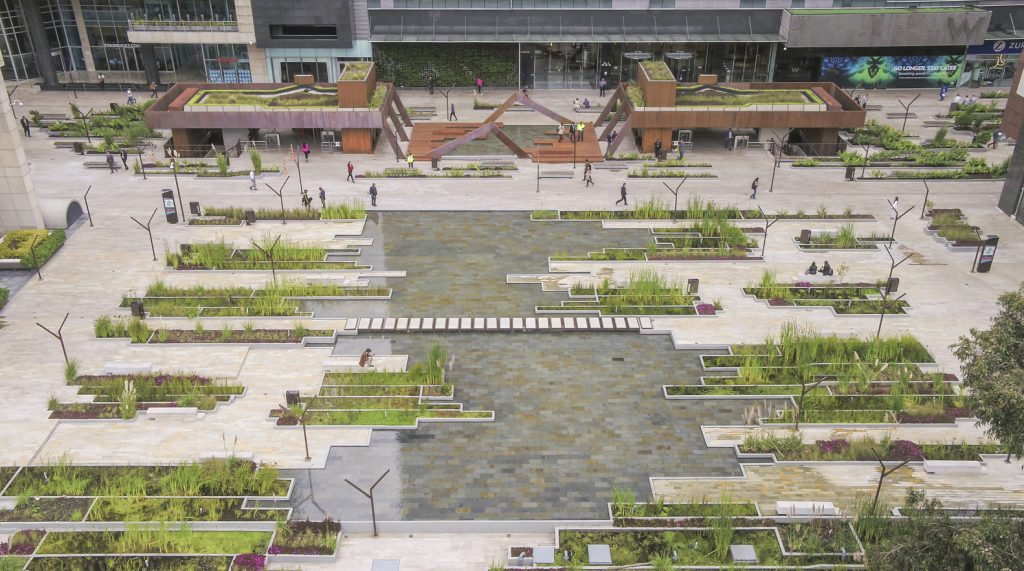 Tasarımda ana meydanın üzerinde, geri dönüştürülmüş bir yağmur suyu bahçesi ile
