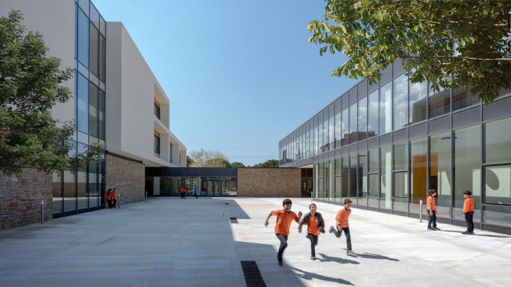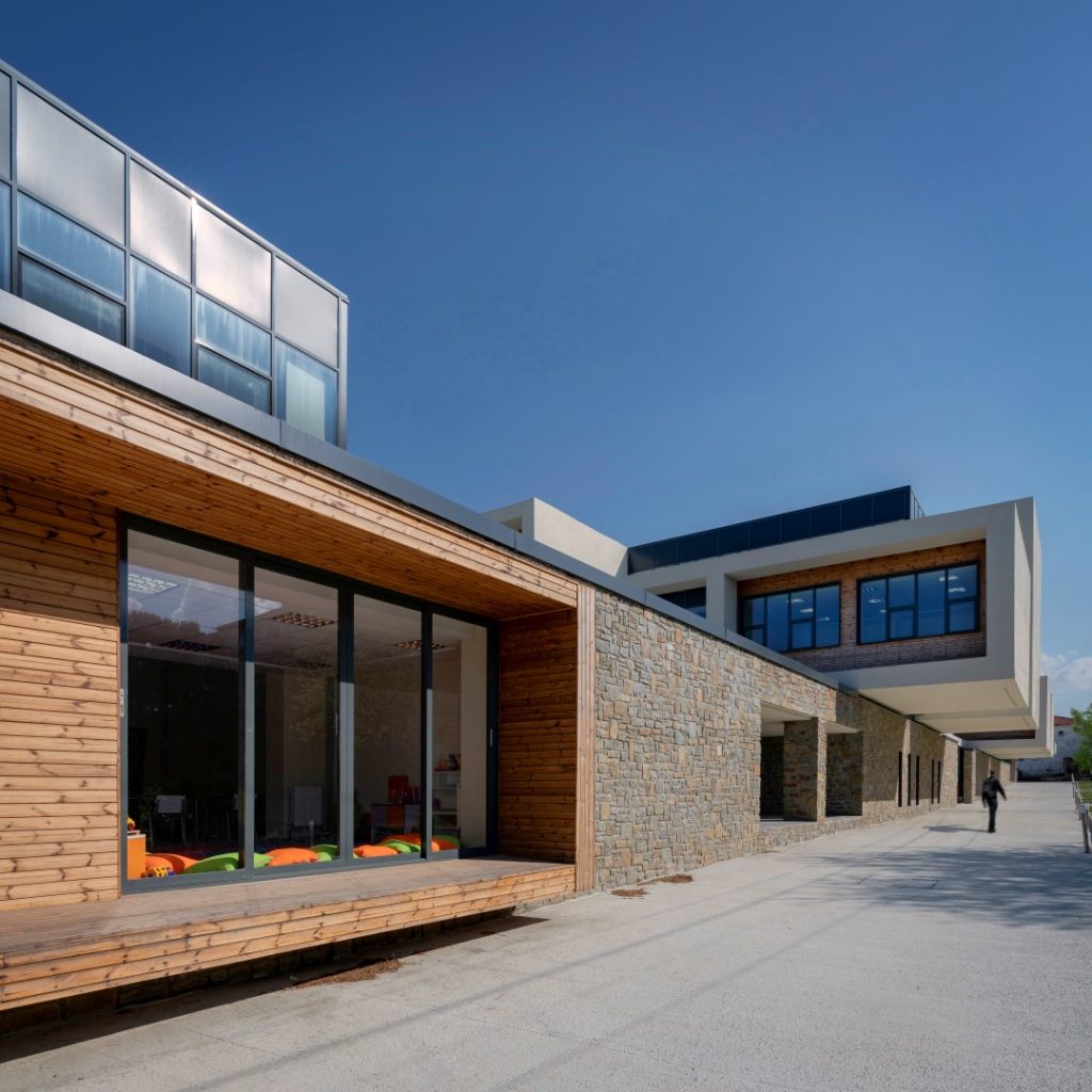 Yerleşkeye ait donatılar adalının gündelik hayatının bir parçası olacak şekilde kurgulanarak, yerleşkenin çevreyi dönüştürecek bir katalizör olması amaçlanmış. Gökçeada’nın köylerindeki küçük ölçekli taş evlerden oluşan karakteristik dokusu, malzeme kararı olarak seçilen yerel taş doku ile parçalı ve az katlı yapılaşma kararını etkilemiş. Yaya rotası üzerinde ve meydan etrafında konumlanan büyük hacimlere sahip spor salonu ve konferans salonu gibi kütleler ise, arazideki kot yapısından faydalanarak kısmi olarak yer altına alınarak, kütlelerin insan ölçeği ve doğal doku ile ilişkisinin korunması sağlanmış. Arazi üzerindeki tüm düzenlemeler çevreyle ve yerel yapısal karakterle uyumlu bir şekilde ele alınmış. Önerilen yapılar ve sert peyzaj alanları (yurt yapısı dışında) arazide yer alan önceki yapıların izleri üzerine yerleşiyor. Mevcut ağaçların yerleşimle uyumlu bir şekilde korunması amaçlanarak, sadece az sayıdaki ağaç doğal ışıktan daha iyi faydalanmaları amacıyla taşınmış. Mevcut ağaçlar ve geliştirilmesi planlanan yeni ağaçlık bölgeler yapıların ve açık alanların doğusu ile kuzeyini yoğun bir şekilde sararak, sert poyrazlara karşı korunaklı bir çeper oluşturacak şekilde planlanmış. Arazinin doğal peyzajı arazi genelinde korunarak, ana peyzaj karakterini oluşturuyor. Tanımlanmış belirli alanlarda özel peyzaj düzenlemeleri, hobi bahçeleri, spor alanları ve etkinlik çayırı kapsamında özel düzenlemelerin daha sonra yapılması planlanmış. Projede zemin döşemelerinde kısmi olarak bazalt kaplama kullanılmış. Proje genelinde ise, bina duvarları, istinat duvarları gibi alanlarda, adanın mimari dokusunda yüzyıllardır kendine yer bulmuş olan yerel kumtaşına yer verilmiş. Binaların zemin kat hizalarında, duvarların dış çeperleri kaba yontu yığma taş örgü duvar tekniği ile oluşturulmuş. Daha sonra ısı yalıtım katmanı ve iç duvarlar inşa edilmiş. Avlu çeperlerinde toprağı tutan veya peyzajdaki kotlanmaları destekleyen diğer duvarlar da aynı teknik ile oluşturulmuş. Proje genelinde, kampüs içerisindeki iki okulun ve ada halkının ortak kullanacağı bir yerleşke fikri, yarışma önerisinin temelini oluşturmuş ve MEB’e sunulan açık kampüs fikrinin yenilikçi bir eğitim modeli olarak pekiştirilmiş.
