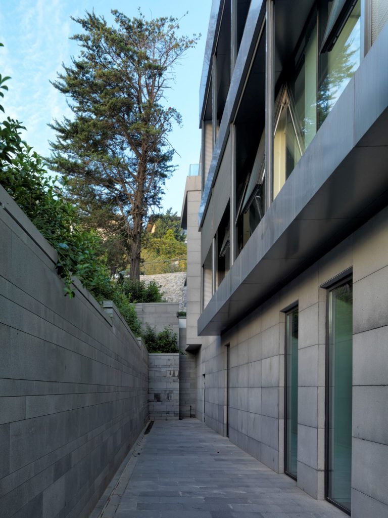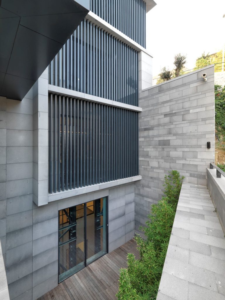 Bener Hukuk Bürosu projesinde kullandığımız taş, Kayseri bölgesindeki bir ocaktan tedarik ettiğimiz bazalt taşı. Projenin tüm dış mekan zeminleri ve bahçe duvarları da dahil, cephelerinde bu taşı kullandık. Montajla ilgili tüm sorumluluk ve uygulama yine bu konuda çok güvendiğimiz, Gökhan Erzi’ye aittir. Gerek detaylar, gerekse malzeme ile süratli ve kaliteli bir iş çıktığını düşünüyorum. Bu projede kullandığımız taşı, dayanıklı, nispeten mekanik montaj detayında bile büyük ebat verebilen, konvansiyonel ebatların dışına çıkılmış olmasına rağmen, fiyatları çok artmayan, porozite özelliklerinden dolayı, daha az lekelenen, canlı yaşayan bir malzeme olduğu için tercih ettik. Ayrıca yaklaşık 300 km uzakta bir ocaktan geldiği için, tedarikçimizin her türlü ebat ve yüzey hazırlığı konusunda bıkmadan, usanmadan, sabırla verdiği destekler sayesinde de tercihimiz kolay oldu diyebilirim. Biz genelde işverenlerimizi, planlanan bütçenin çok üzerine çıkılmadığında ikna etmek durumunda kalmıyoruz. Müşterilerimiz -eğer bir kamu binası tasarlamıyorsak- zaten yapıların sahipleri ve kullanıcıları olarak, tasarımın her safhasında ve tabii ki malzeme kararları anında da bizimle birlikte oldukları için böyle bir süreç yaşanmıyor. Suni malzemeleri tercih ettiğini söyleyen işverenlerle de zaten çok az karşılaşıyoruz. Projelerimde sadece doğal taş kullanımını değil, tüm doğal malzemeleri önemsiyorum. Özellikle lokal, hesaplı ve uzun süre dayanacak malzemelerden vazgeçmemeye çalışıyorum. Küçük ölçekli ve yerel malzemelerin kolaylıkla bulunduğu yerlerde, işim tabii ki daha kolay oluyor. Basit araştırmalarla, işçilik maliyetleri, malzemenin anlaşılmış olması ve sürprizler barındırıyor olmaması sayesinde, yapı malzemesi olarak veya yapı elemanı olarak kullanıp, kullanmayacağıma kolay karar veriyorum; müşteriyi de o bağlamda yönlendirmem kolay oluyor. Ayrıca modern yapı malzemelerinin ve modern tasarım yaklaşımlarının, doğal ve yerel malzemelerle harmanlandığı takdirde, kalıcı ve özgün kullanım imkanları verdiğini de düşünüyorum. Bu nedenle doğal malzemelerden uzak durmamaya gayret ediyorum.